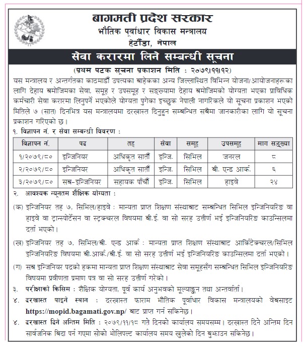 बागमती प्रदेशको भौतिक पूर्वाधार विकास मन्त्रालयले इन्जिनियर र सब-इन्जिनियर माग गरेको छ।