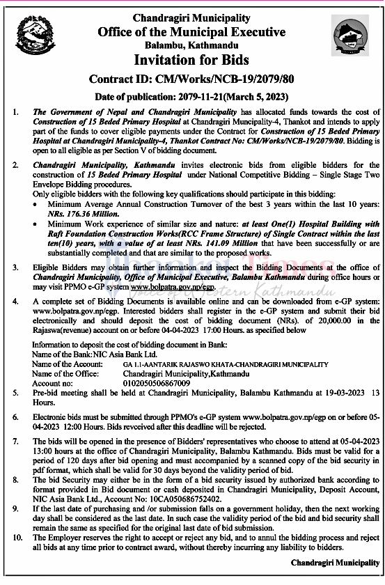 आइतबार प्रकाशित सूचना अनुसार चैत्र २२ गतेभित्र योग्यता पुगेका इच्छुक निर्माणकर्ताले टेण्डर पेश गर्न सक्ने जनाइएको छ ।