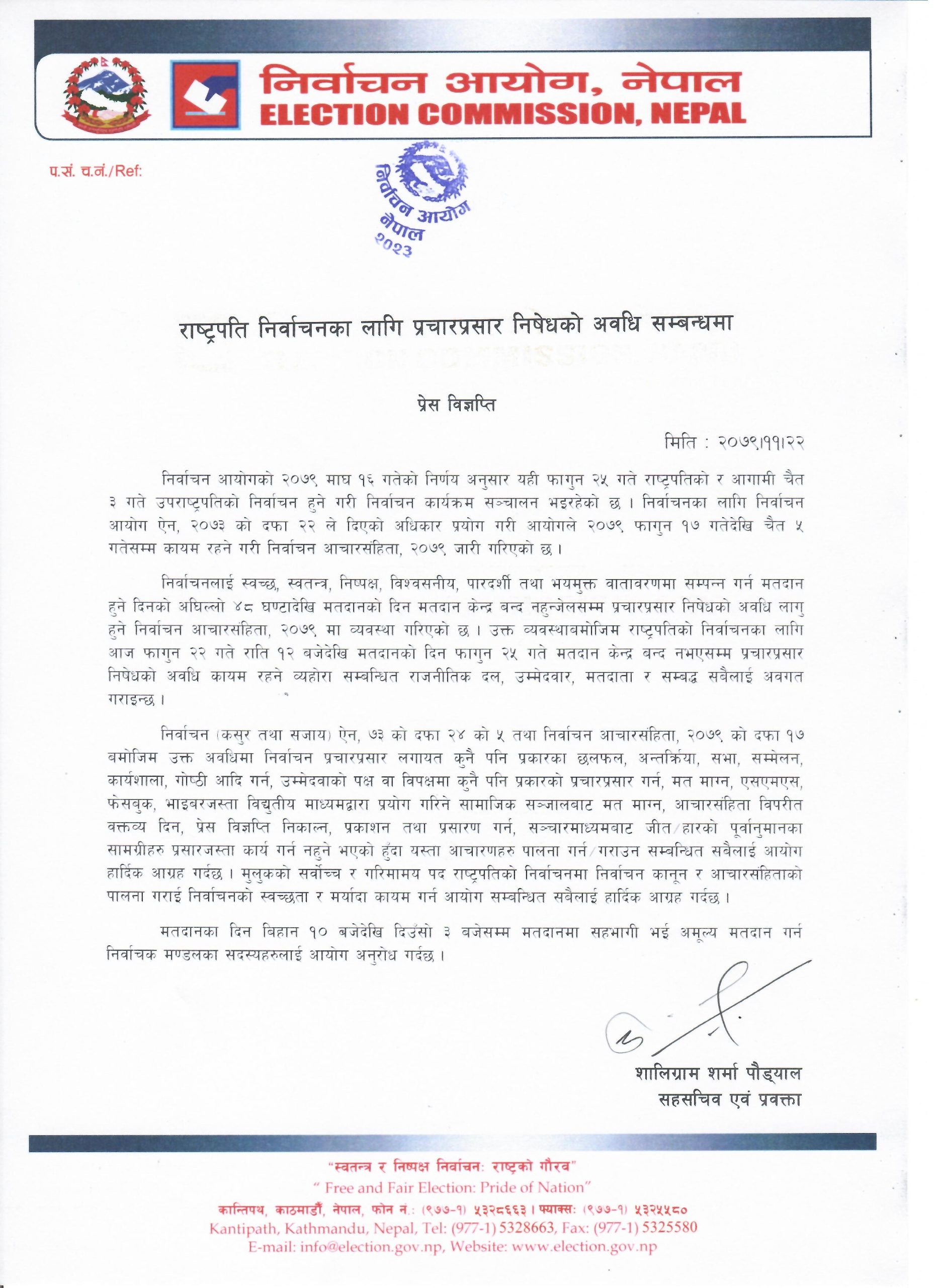 आज राति १२ बजेदेखि मतदानको दिन फागुन २५ गते मतदान केन्द्र बन्द नभएसम्मका लागि प्रचारप्रसार निषेध गरिएको निर्वाचन आयोगका प्रवक्ता शालिग्राम शर्मा पौड्यालले जानकारी दिए ।