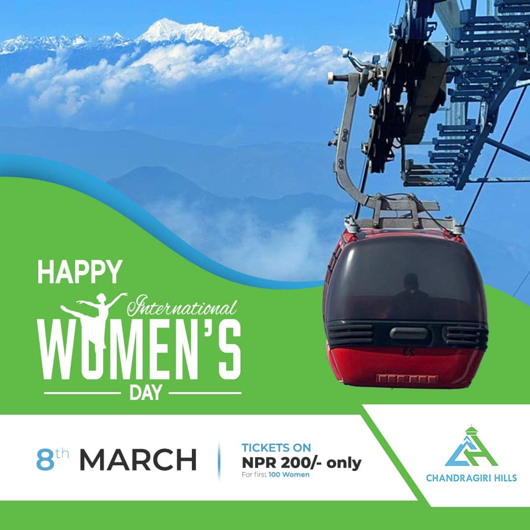 अन्तर्राष्ट्रिय नारी दिवसका दिन भोलि बुधबार १ सय जना महिला यात्रुहरूले २ सय रुपैयाँमै चन्द्रागिरि केबलकारको टिकट पाउने भएका छन् । अन्तर्राष्ट्रिय महिला दिवसको अवसर पारी कम्पनीले यस्तो घोषणा गरेको हो ।