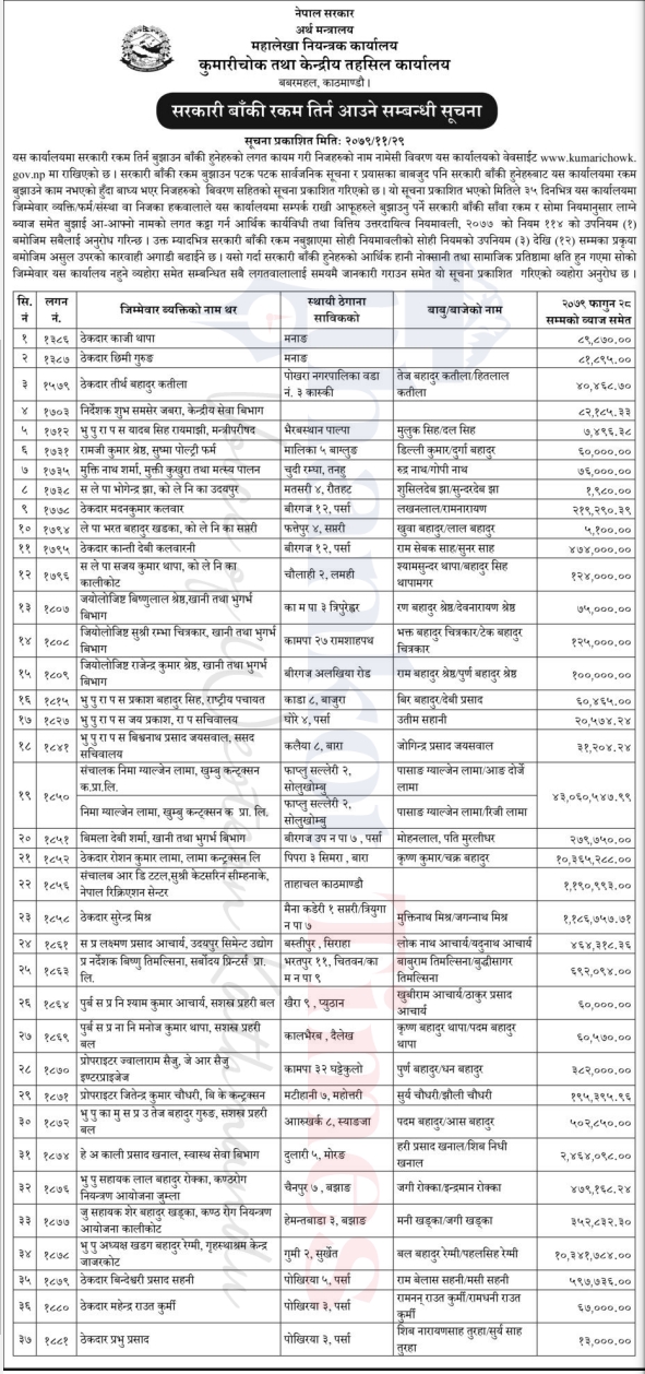 महालेखा नियन्त्रक कार्यालयले सरकारी बाँकी रकम नतिरेकाहरुको नामावली सार्वजनिक गरेको छ ।
