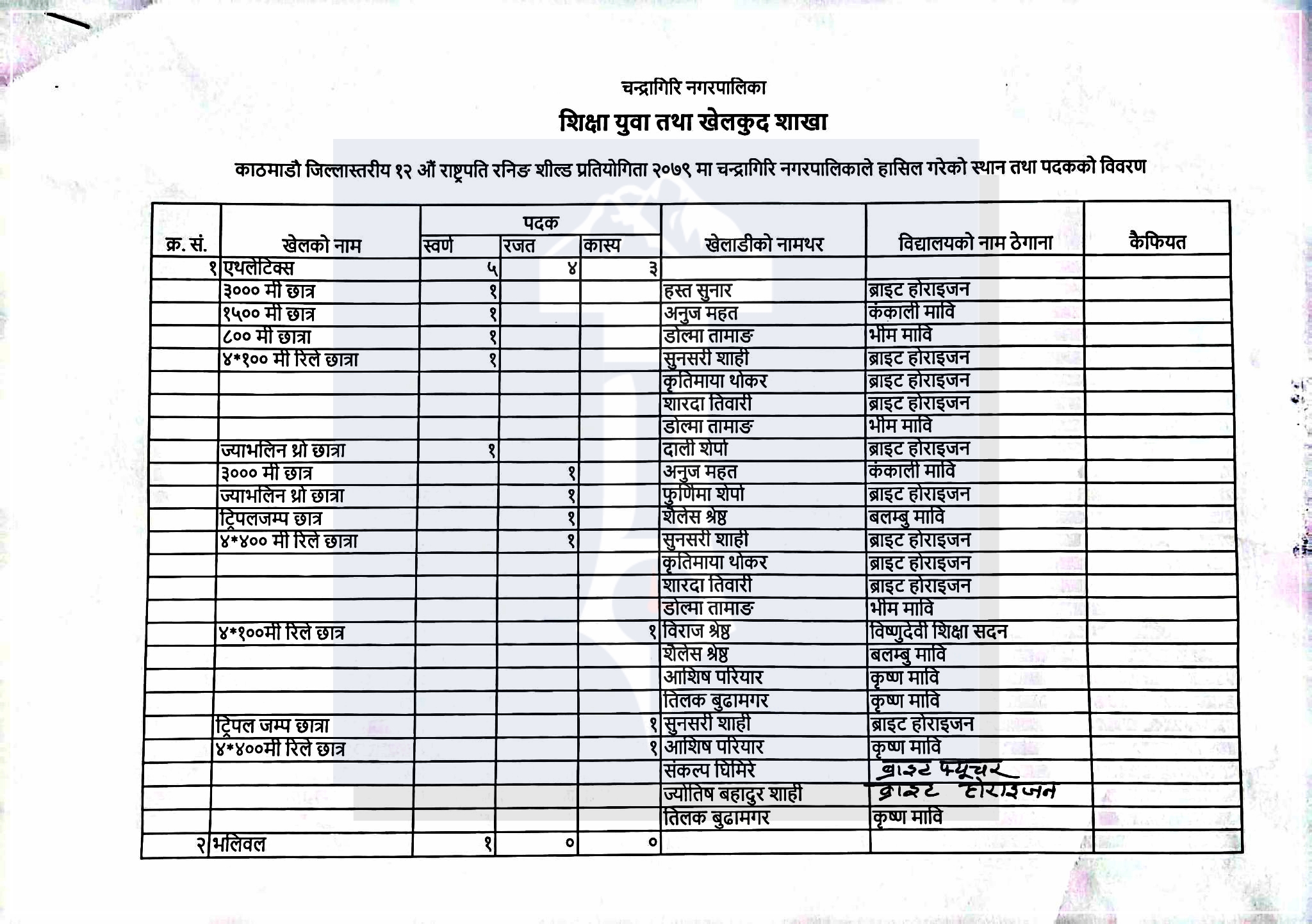 चन्द्रागिरि नगरपालिकाले छात्रा ट्रिपल जम्प, र ४x४०० मिटर रिले दाैडमा कास्य जितेको छ भने एथलेटिक्समा ४ रजत र ३ कास्य जित्यो ।