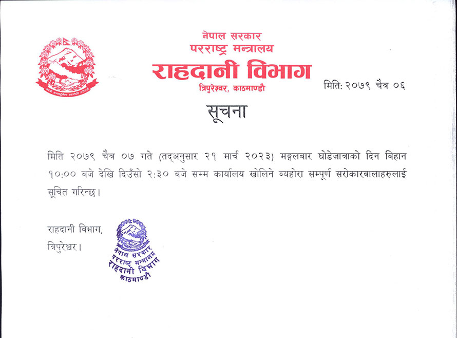 विभागद्वारा जारी सूचनामा भनिएको छ, ‘..घोडेजात्राको दिन विहान १० बजेदेखि दिउँसो २:३० बजेसम्म कार्यालय खोलिने व्यहोरा सम्पूर्ण सरोकारवालाहरुलाई सूचित गरिन्छ।’