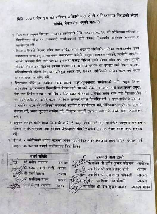 सरकारी वार्ता टोली र मिटरब्याज विरुद्धको संघर्ष समितिबीच सहमति