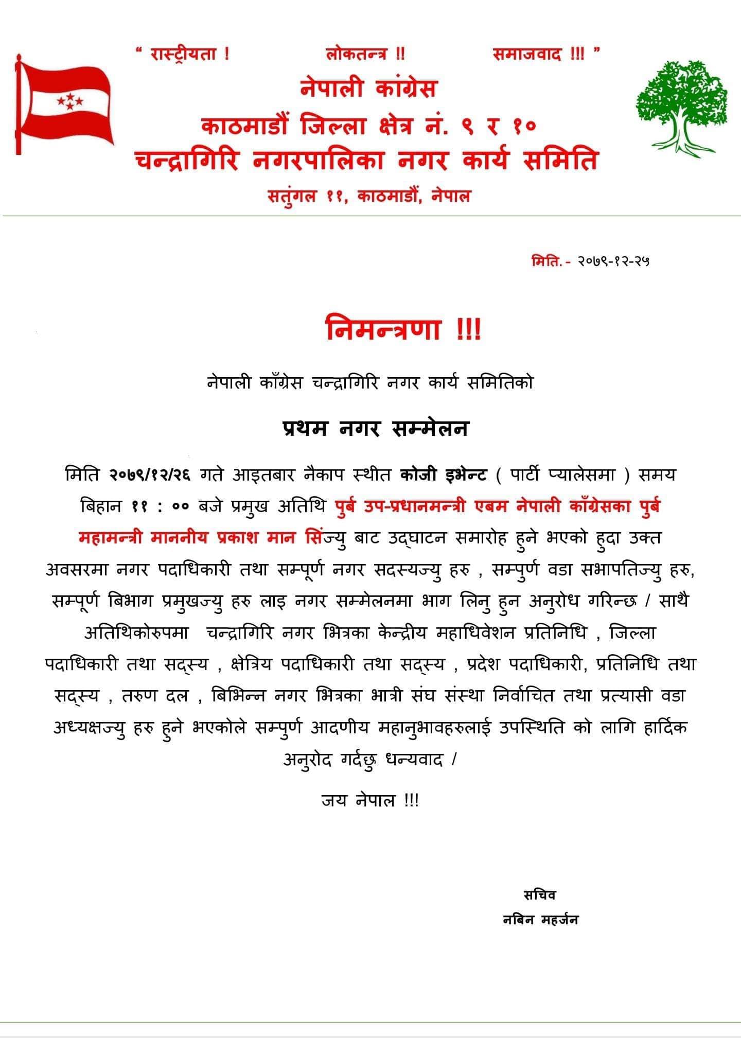 नेपाली कांग्रेस पार्टीको चन्द्रागिरि नगरको प्रथम सम्मेलन आइतबार आज हुँदैछ ।