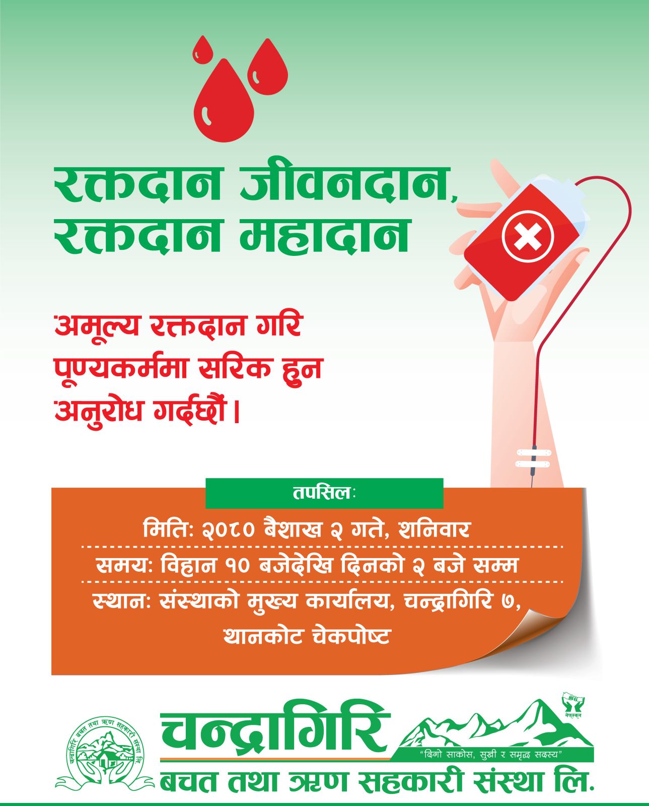 चन्द्रागिरि बचत तथा ऋण सहकारी संस्थाले संस्था स्थापनाको २२औं वार्षिकोत्सवको अवसरमा आगामी बैशाख २ गते शनिबार बृहत रक्तदान कार्यक्रम आयोजना गर्ने भएको छ ।