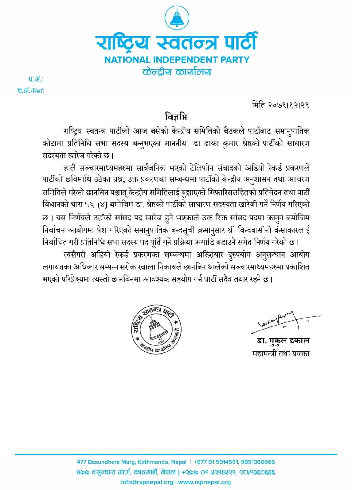 रास्वपाले अडियो प्रकरणमा मुछिएका सांसद ढाकाकुमार श्रेष्ठलाई कारबाही गर्दै कंसाकारलाई सांसद बनाउने निर्णय लिएको हो ।