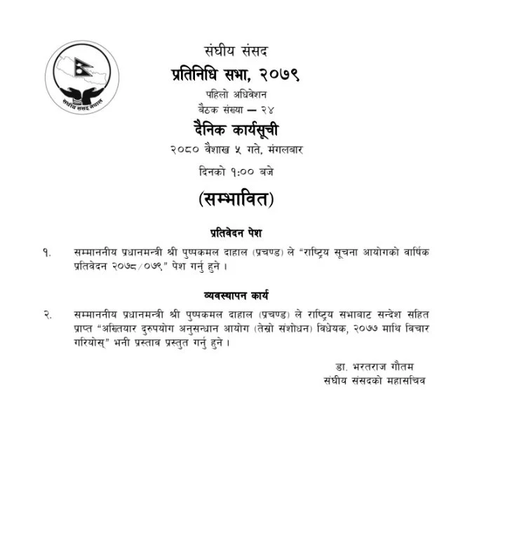 प्रधानमन्त्री प्रचण्डले नै आज राष्ट्रियसभाबाट सन्देशसहित प्राप्त अख्तियार दुरुपयोग अनुसन्धान आयोग (तेस्रो संशोधन) विधेयक, २०७७ प्रस्तुत गर्ने सम्भावित कार्यसूची रहेको संसद् सचिवालयले जनाएको छ ।