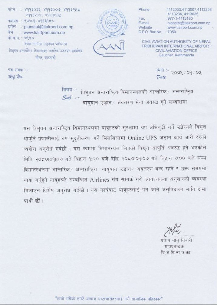 नेपाल नागरिक उड्डयन प्राधिकरण, त्रिभुवन अन्तर्राष्ट्रिय विमानस्थल नागरिक उड्डयन कार्यालयले वैशाख ७ गते बिहान १ बजेदेखि बिहान ७ बजेसम्म उडान बन्द रहने जानकारी दिएको छ ।
