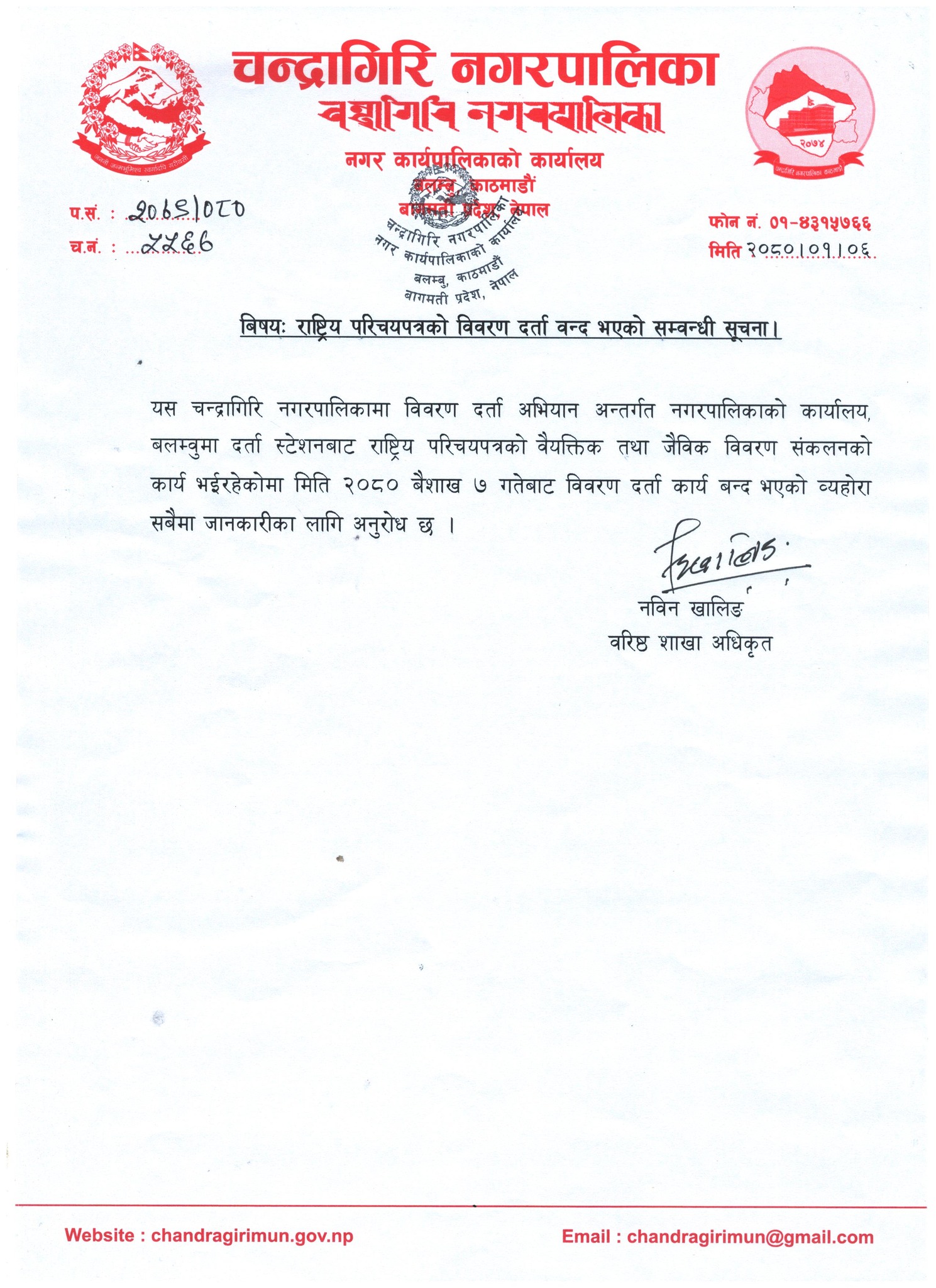 चन्द्रागिरि नगरपालिकामा राष्ट्रिय परिचयपत्रको विवरण दर्ता बन्द हुने भएको छ।