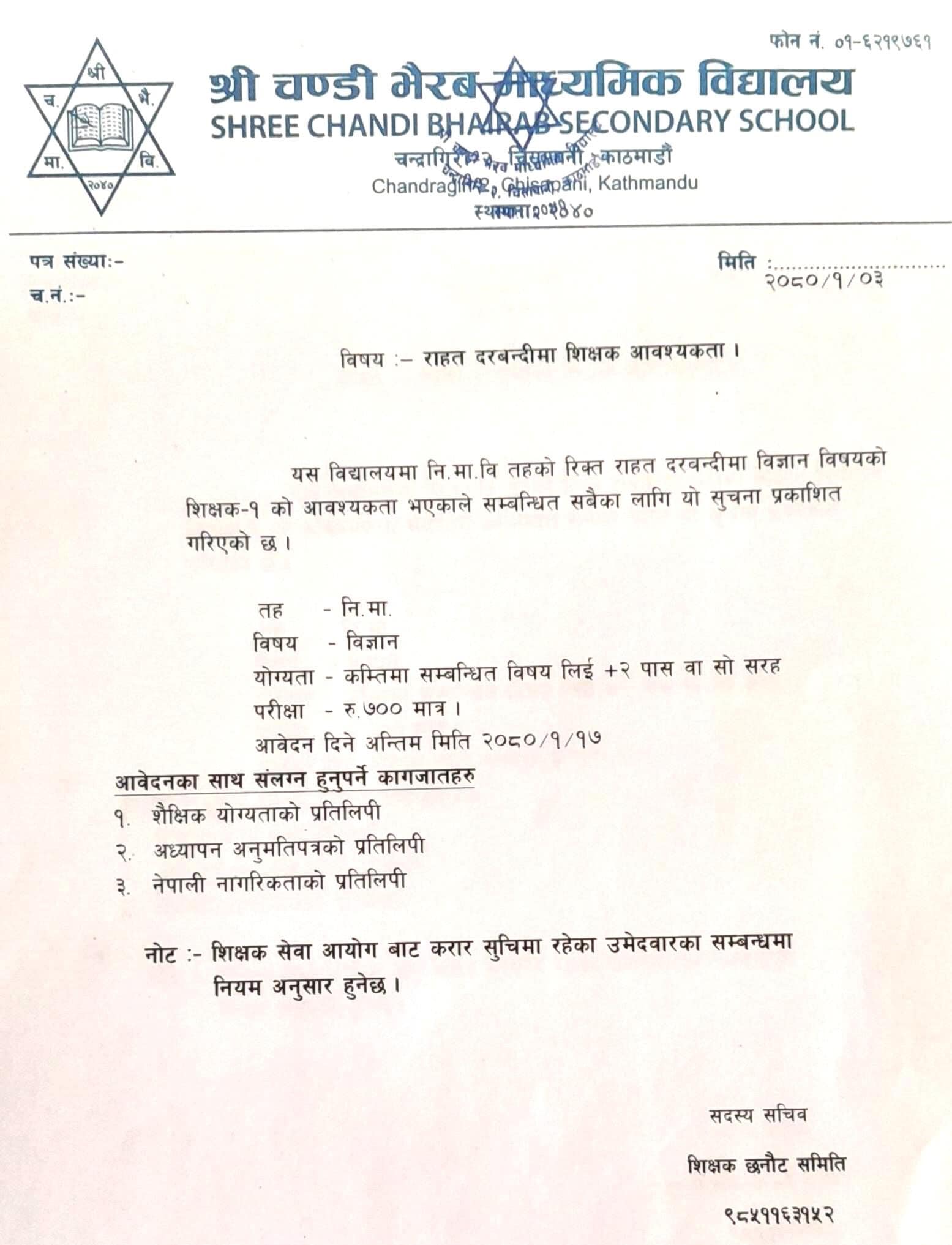 चण्डीभैरब माध्यमिक विद्यालयमा विज्ञान विषयको शिक्षकका लागि खुल्यो दरखास्त