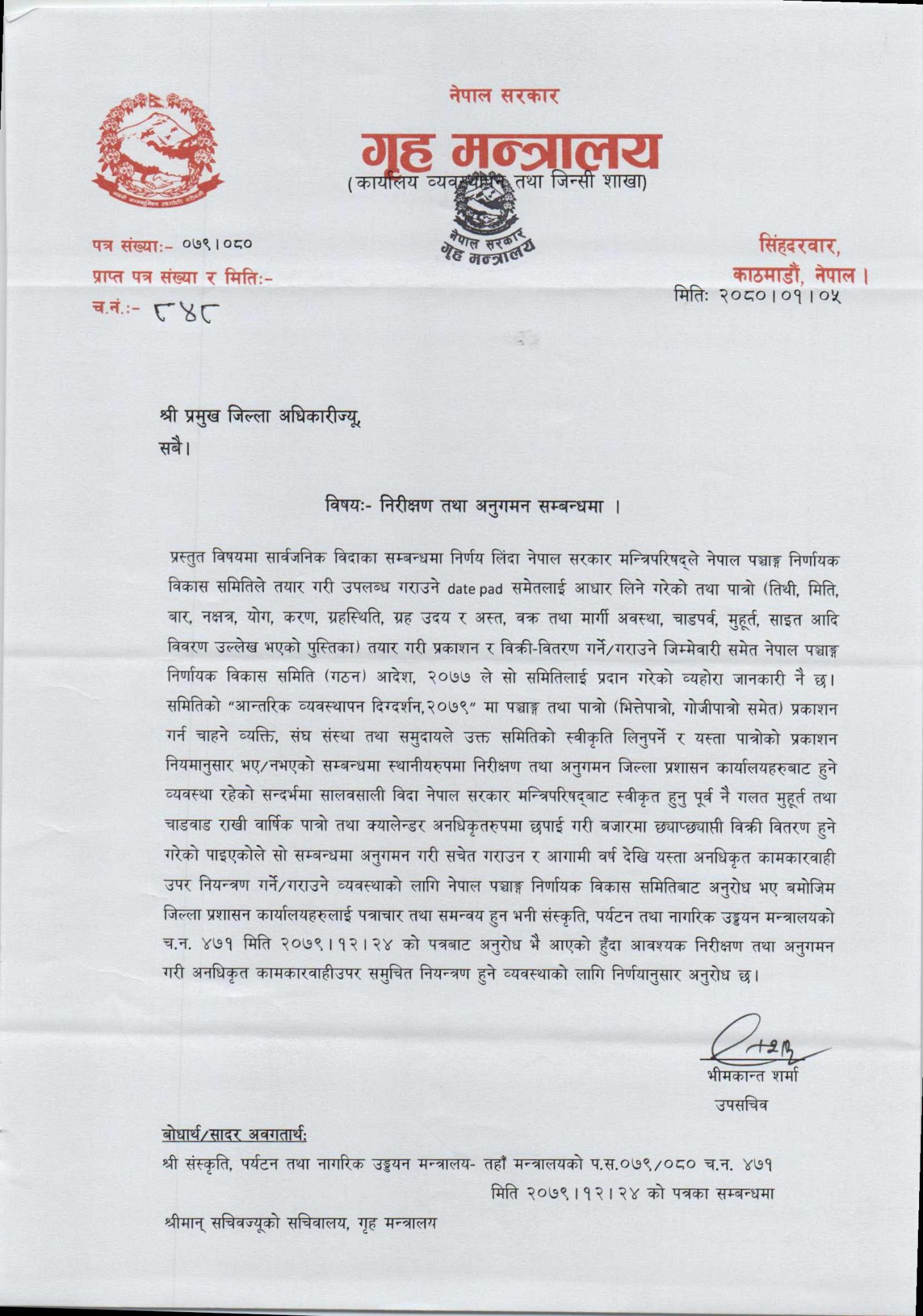 सरकारले बिदा स्वीकृत गर्नुपूर्व नै स्वीकृति नलिई गलत मुहूर्त र चाडपर्व राखी प्रकाशन भएका पात्रो, भित्तेपात्रो र गोजीपात्रो बजारमा छ्याप्छ्याप्ती रहेकाले निरीक्षण एवं अनुगमन गरी सचेत गराउन र आगामी वर्षदेखि यस्ता काम कारबाही नियन्त्रण गर्न÷गराउन पनि मन्त्रालयले जिल्ला प्रशासन कार्यालयहरूलाई निर्देशन दिएको छ ।