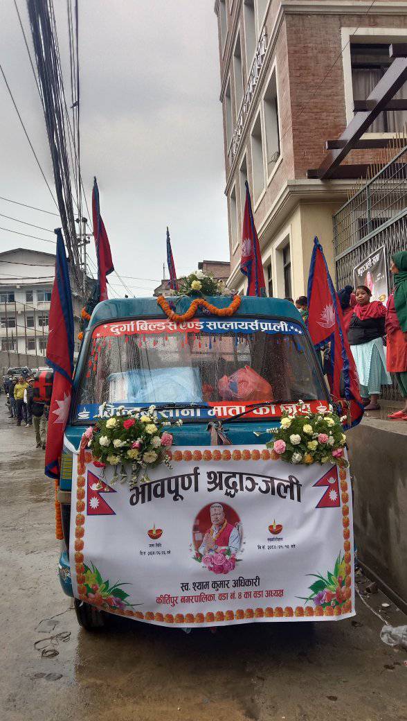 सिमसिमे पानीका बीच वडाध्यक्ष अधिकारीप्रति श्रद्धाञ्जली व्यक्त गर्न हजाराैं नगरबासी तथा शुभेच्छुकहरू अहिले कीर्तिपुरस्थित नगरपालिका कार्यालयमा भेला भएका छन् ।
