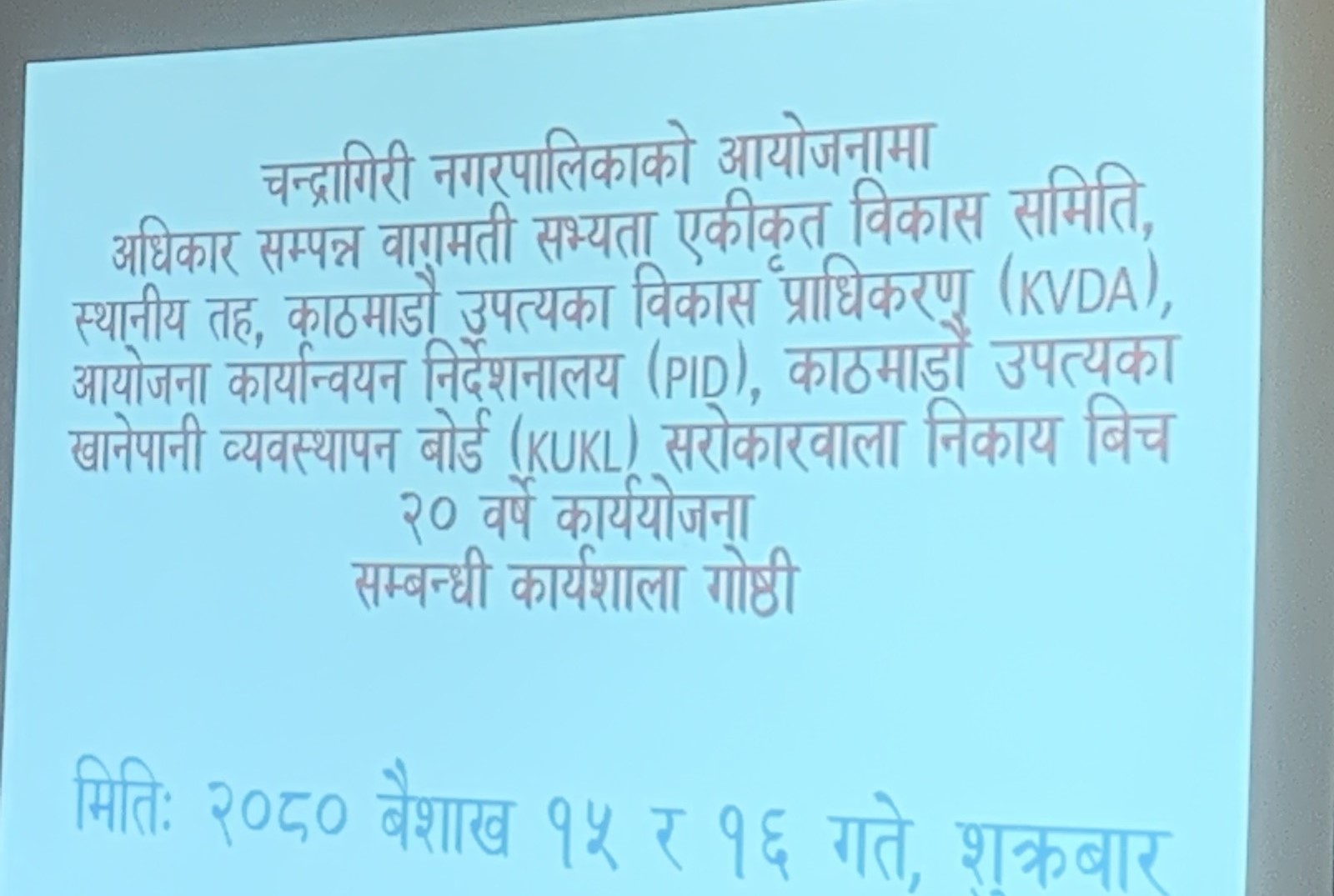 चन्द्रागिरि नगरपालिकाको संयोजनमा शुक्रबार र शनिबार आयोजित एक कार्यशालामा ती चारवटा नगरपालिकाका प्रमुख, उपप्रमुख, बागमती सुधार आयोजना, उपत्यका विकास प्राधिकरण, काठमाडाैं उपत्यका खानेपानी लिमिटेड, आयोजना कार्यान्वयन निर्देशनालय तथा खानेपानी मन्त्रालयका उच्च अधिकारीहरूसहितको टोलीबाट लिखित प्रतिबद्धता भएको बताइएको छ ।
