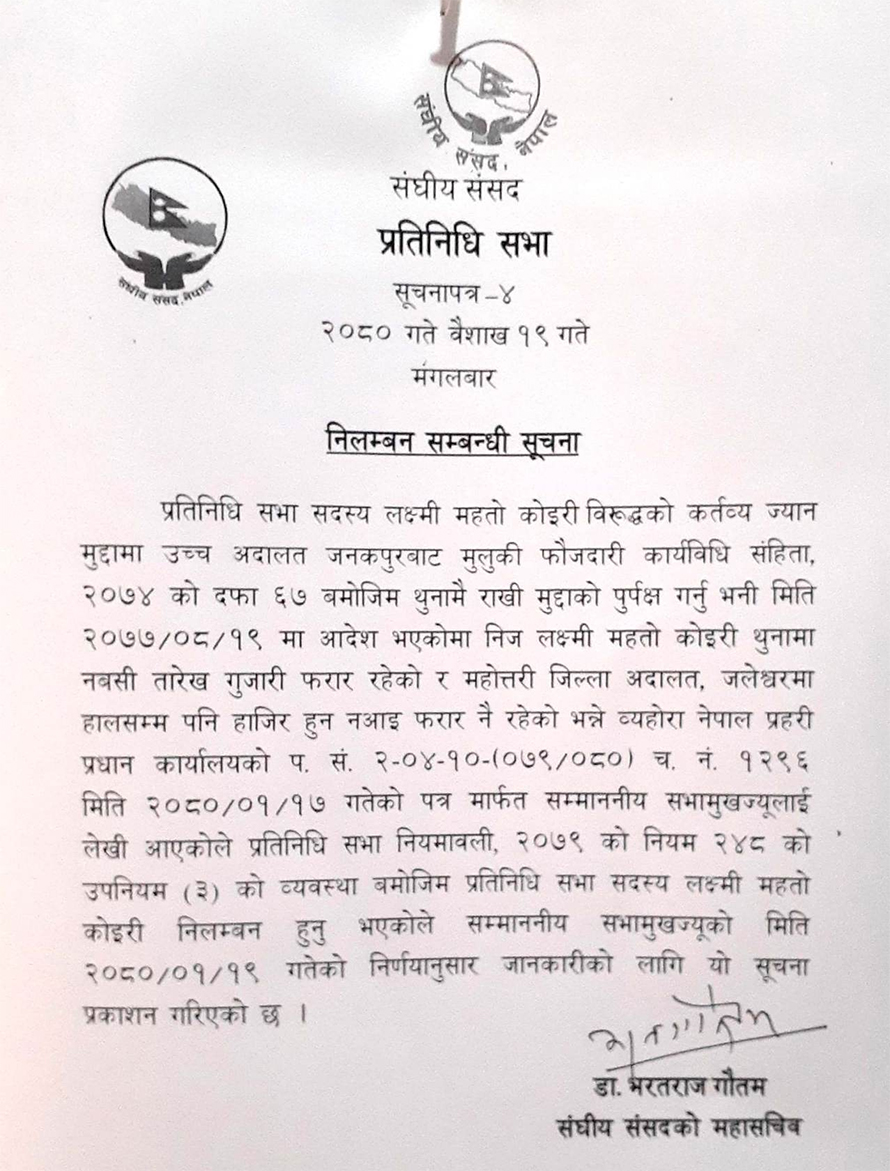 सभामुख देवराज घिमिरेले प्रतिनिधिसभा सदस्य लक्ष्मी महतो कोइरीलाई निलम्बन गरेका छन् ।