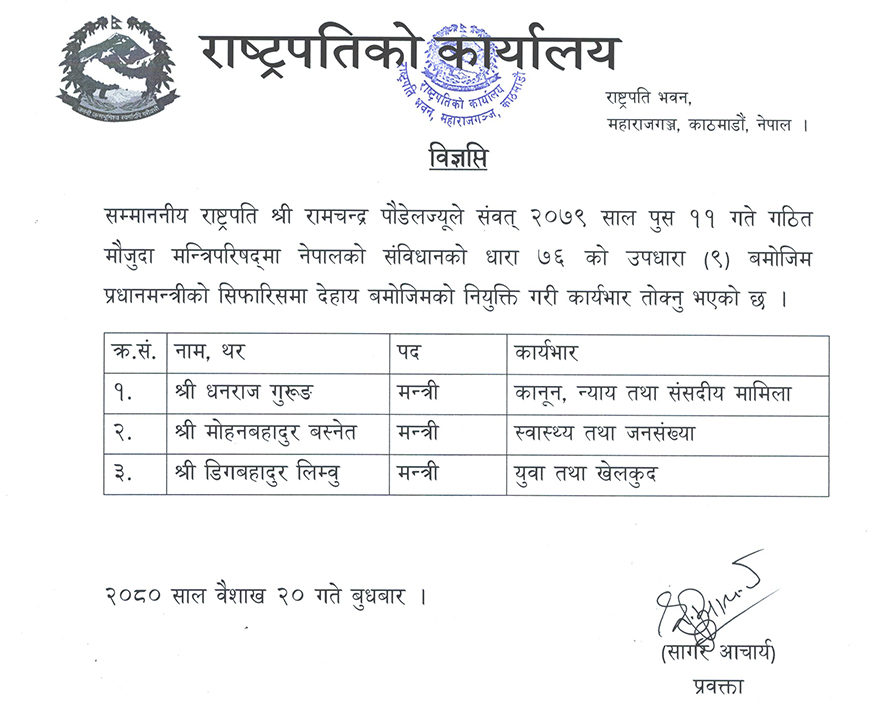 ३ जना मन्त्री नियुक्तिसँगै वर्तमान मन्त्रिपरिषद् २२ सदस्यीय भएको छ ।
