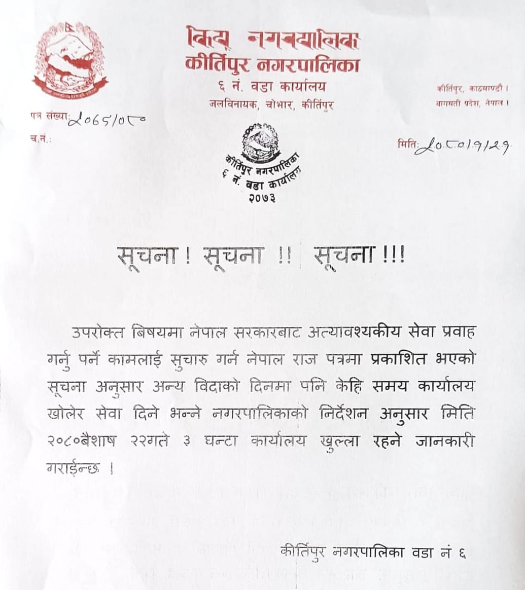 कीर्तिपुर नगरपालिका वडा नं. ६ जलविनायक, चोभारको कार्यालय बिहीबार एक सूचना जारी गर्दै नेपाल सरकारबाट अत्यावश्यकीय सेवा प्रवाह गर्नुपर्ने कामलाई सुचारू गर्न नेपाल राजपत्रमा प्रकाशित भएको सूचना अनुसार अन्य बिदाको दिनमा पनि केहि समय कार्यालय खोलेर सेवा दिने भन्ने नगरपालिकाको निर्देशन अनुसार सो दिन ३ घण्टा कार्यालय खुल्ला रहनेछ जनाएको हो ।