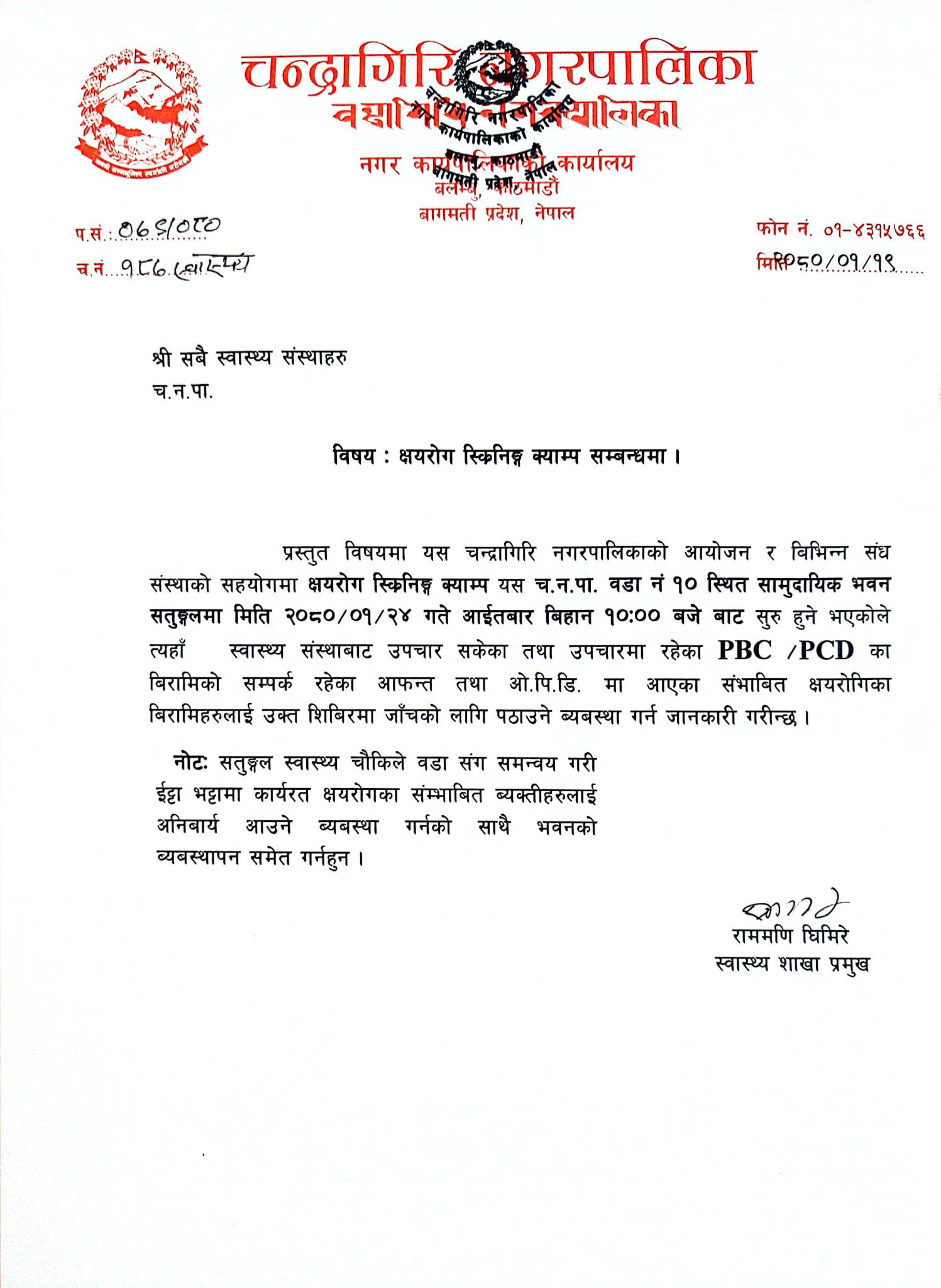 चन्द्रागिरि नगरपालिकाले नगरबासीहरूको निःशुल्क रूपमा क्षयरोगको स्क्रिनिङ्ग गर्ने भएको छ ।