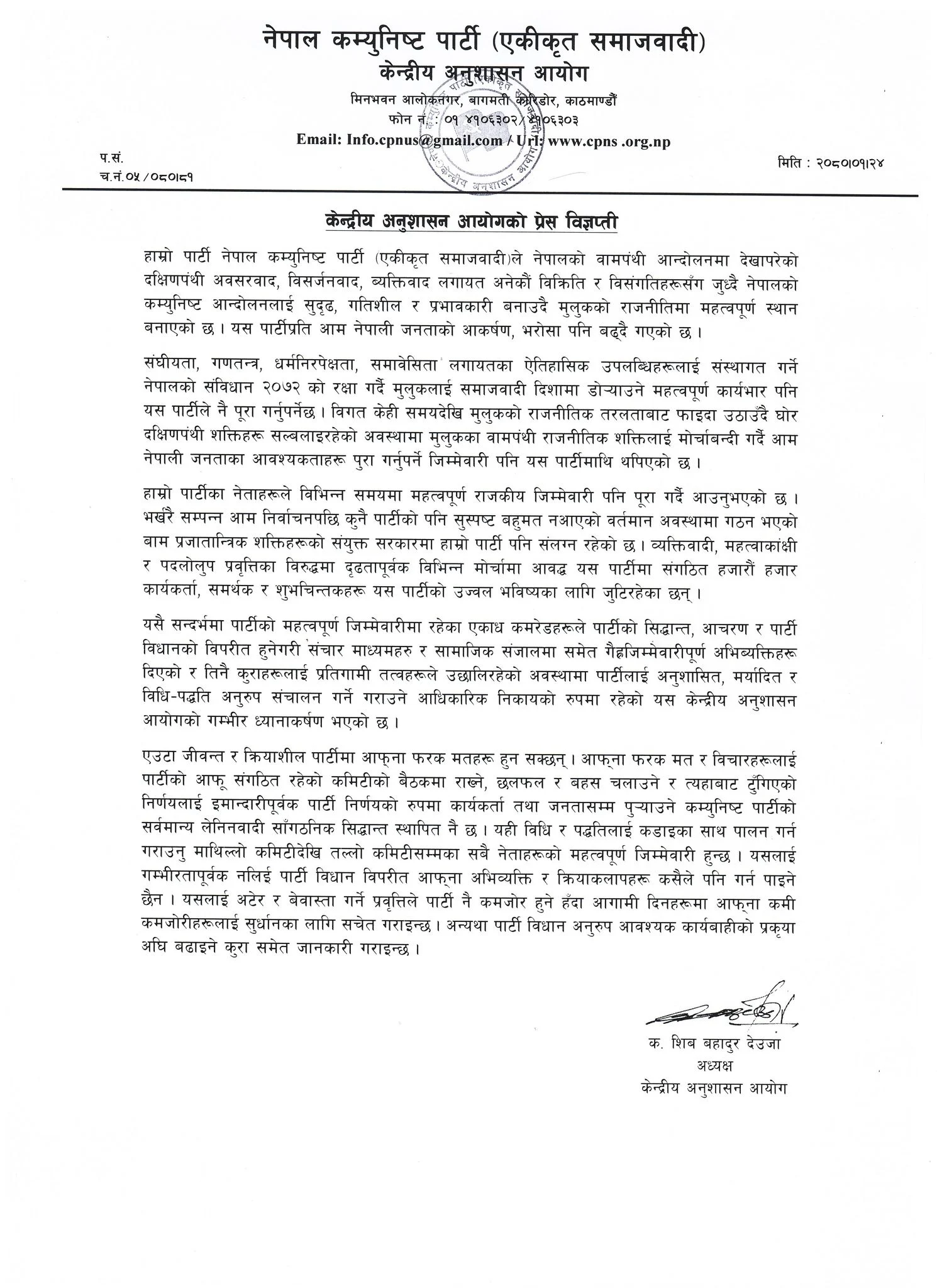 केही नेताहरूले गैह्रजिम्मेवारीपूर्ण अभिव्यक्तिहरू दिएको र तिनै कुराहरूलाई प्रतिगामी तत्त्वहरूले उछालिरहेको भन्दै आयोगले गम्भीर ध्यानाकर्षण भएको जनाएको हो । अध्यक्ष शिव बहादुर देउजाले जारी गरेको विज्ञप्तिमा आफ्ना फरक मत र विचारहरूलाई पार्टीको आफू संगठित रहेको कमिटीको बैठकमा राख्ने, छलफल र बहस चलाउन समितिले आग्रह गरिएको छ ।