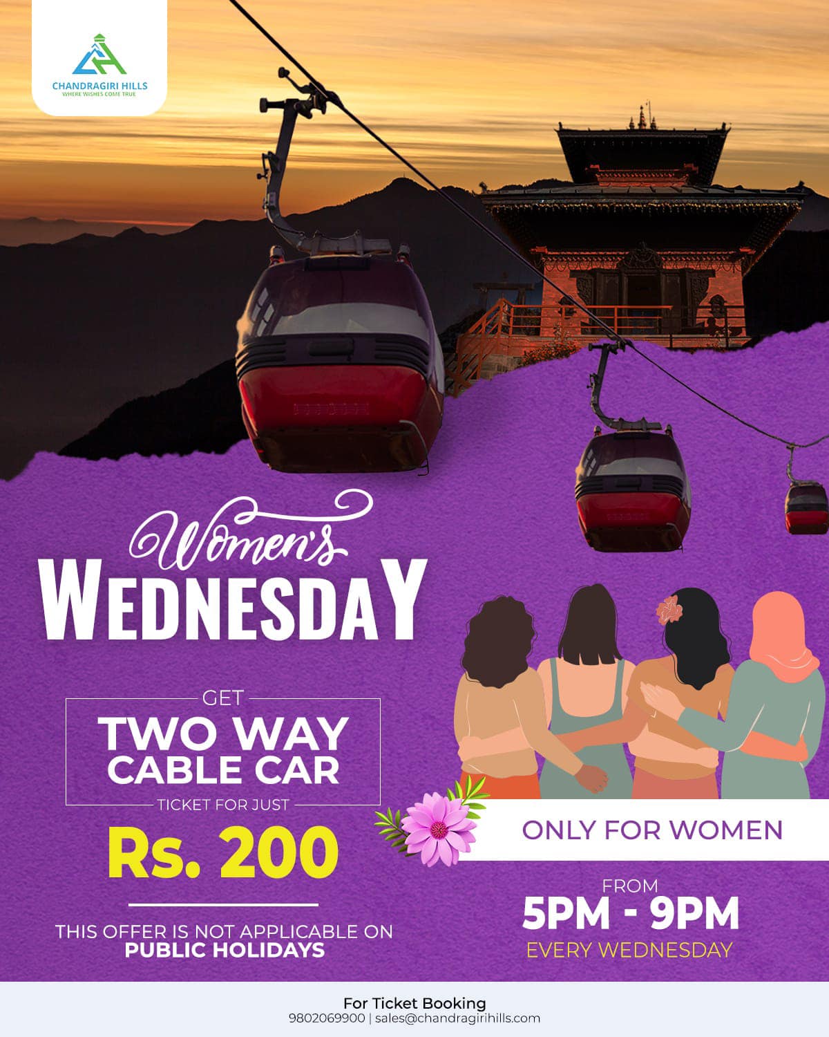 सार्वजनिक बिदाका दिन बाहेक हरेक बुधबार साँझ ५ बजेपछि केबलकार यात्रा गर्न महिलाहरूले २ सय रूपैयाँमा दुई तर्फी टिकट पाउने चन्द्रागिरि हिल्सले जनाएको छ।