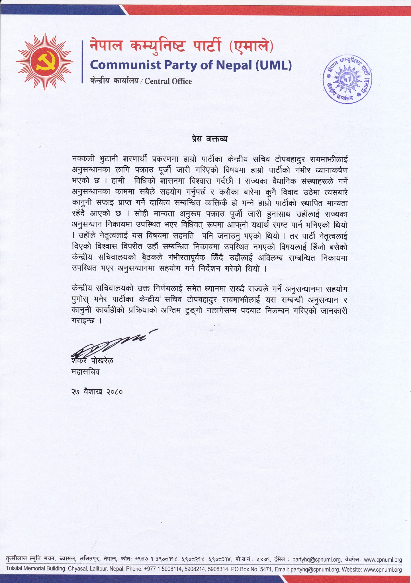 राज्यले गर्ने अनुसन्धानमा सहयोग पुगोस् भनेर एमाले पार्टीले केन्द्रीय सचिव टोपबहादुर रायमाझीलाई यस सम्बन्धी अनुसन्धान र कानुनी कारवाहीको प्रक्रियाको अन्तिम टुंगो नलागेसम्म पदबाट निलम्बन गरिएको महासचिव शंखर पोखरेलद्वारा हस्ताक्षर गरिएको प्रेस विज्ञप्ति मार्फत जनाएको छ ।
