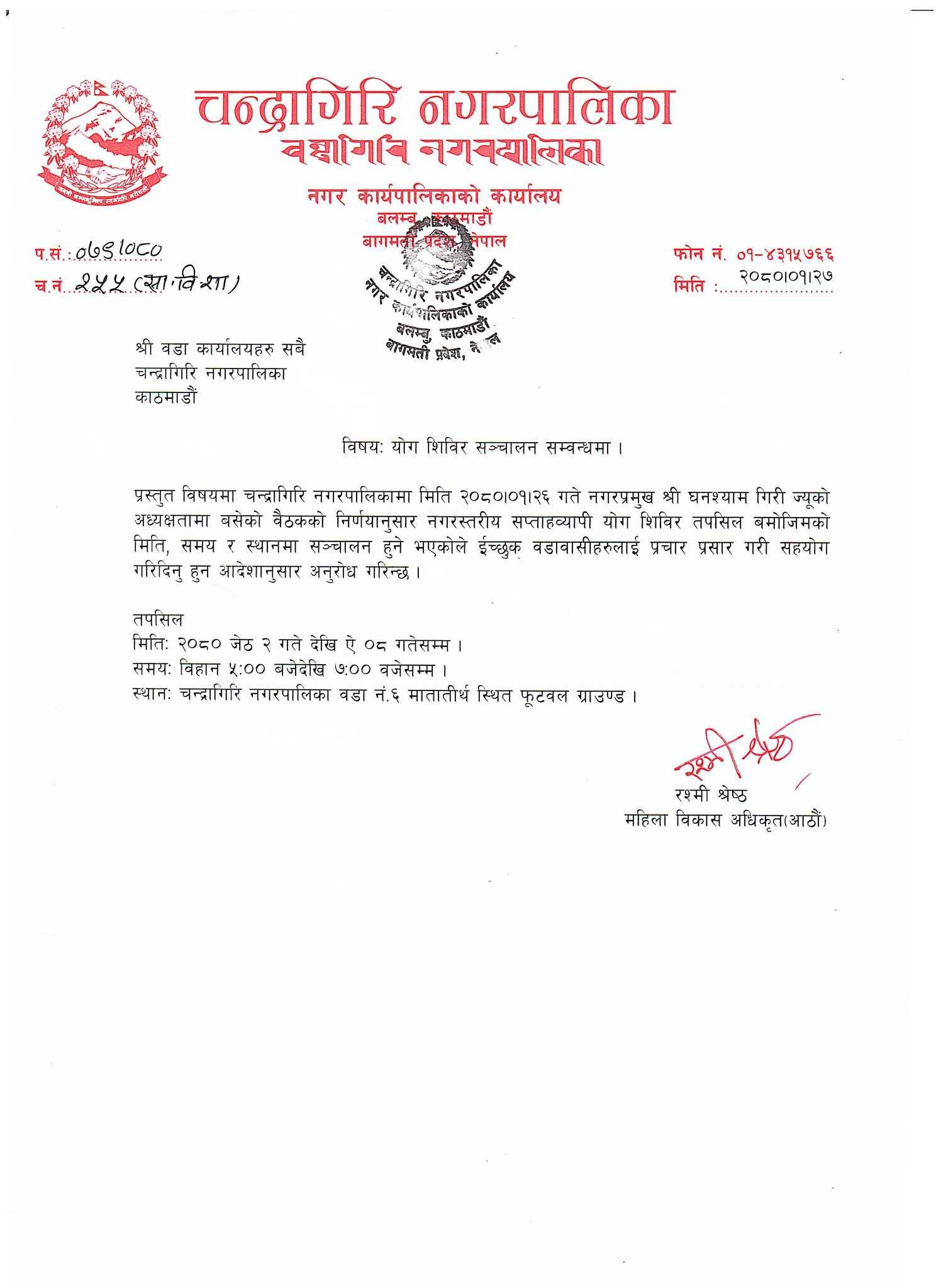 चन्द्रागिरि नगर योग समितिले सो कार्यक्रमको व्यवस्थापन गर्ने नगरपालिकाको सामाजिक विकास शाखा प्रमुख रश्मी श्रेष्ठले जानकारी दिनुभयो ।