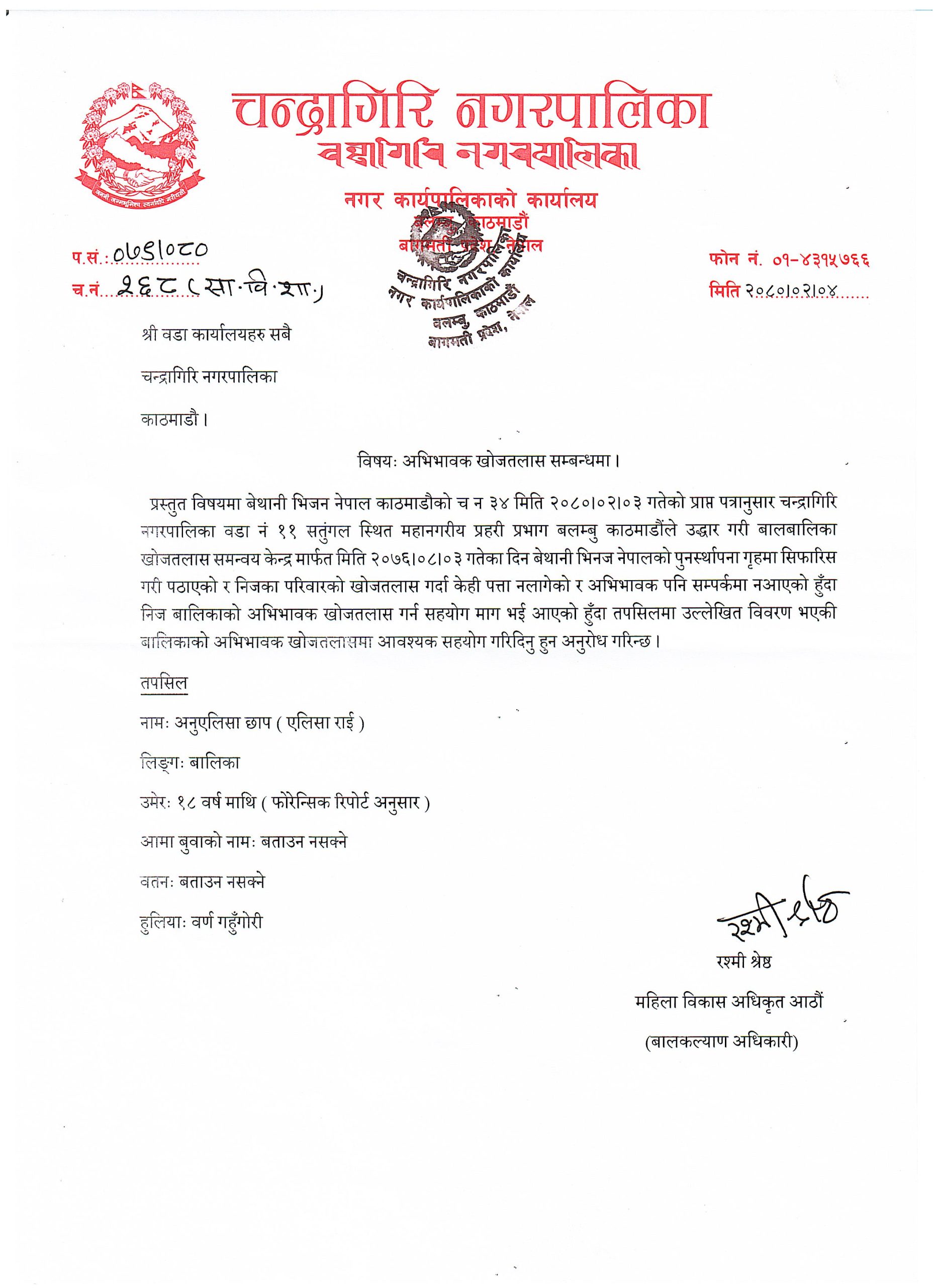 २०७६ मंसिर ३ गते उद्धार गरी बालबालिका खोजतलास समन्वय केन्द्रमार्फत बेथानी भिनज नेपालको पुनस्थापना गृहमा सिफारिस भएकी एलिसा राईको अभिभावक अझै सम्पर्कमा नआएपछि चन्द्रागिरि नगरपालिकाले अभिभावक पहिचानका लागि सहयोग मागेको छ ।