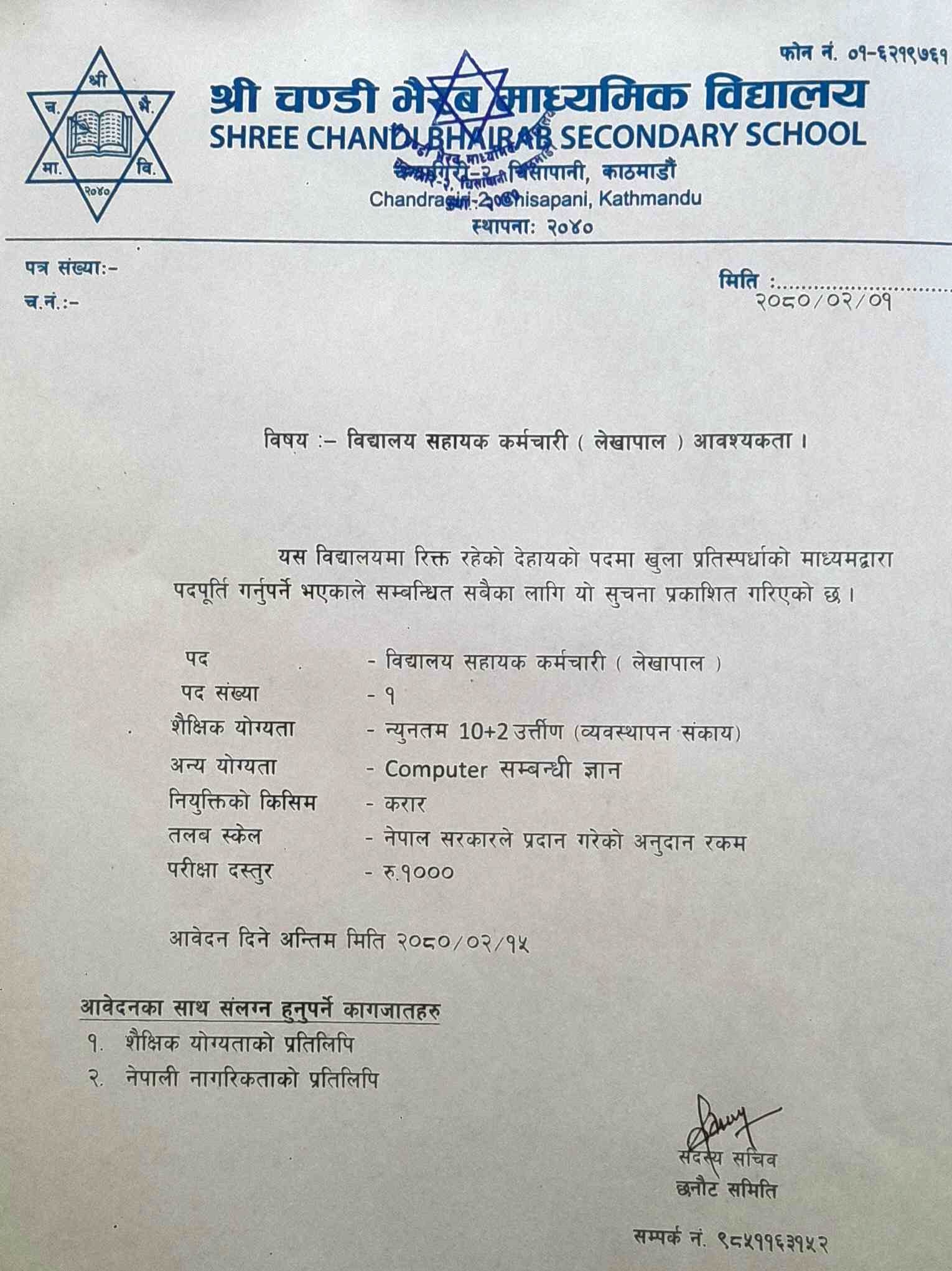 चन्द्रागिरिको एक सरकारी विद्यालयले माग्यो लेखापाल, तलब नेपाल सरकारको नियमानुसार