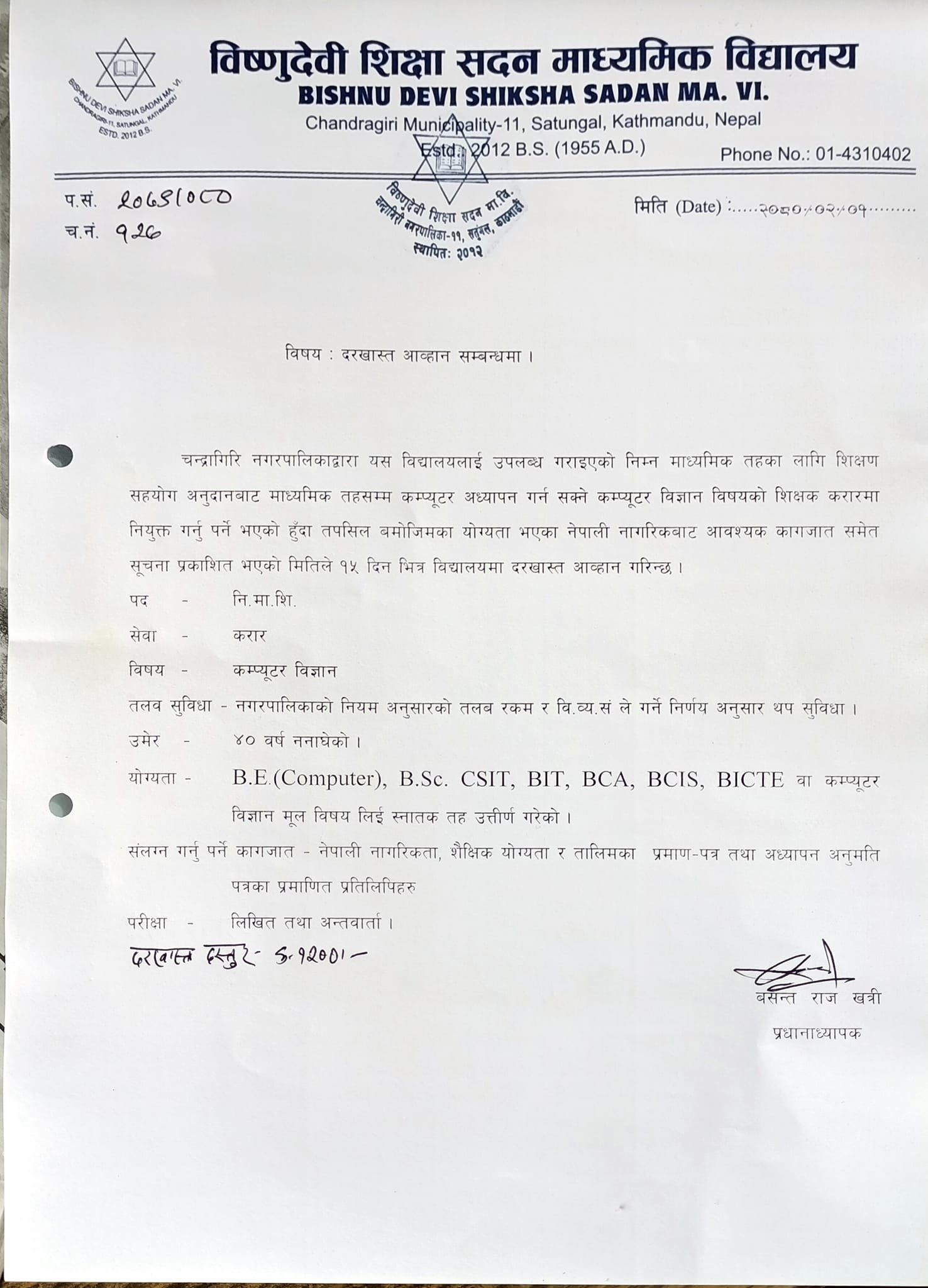 खुला प्रतिस्पर्धाबाट पदपूर्ति हुने गरी विष्णुदेवी शिक्षा सदन माविले कम्प्युटर विज्ञान शिक्षण शिक्षक माग गरेको हो ।