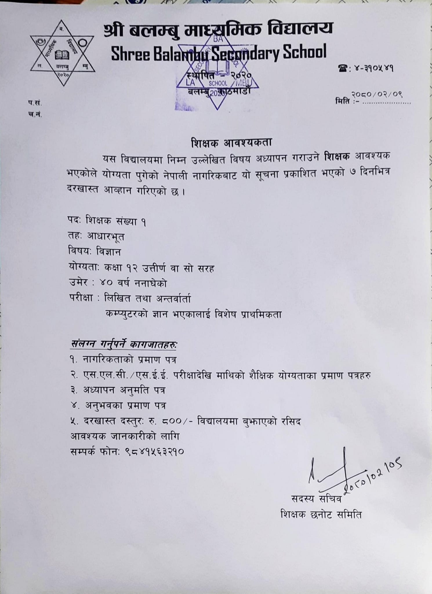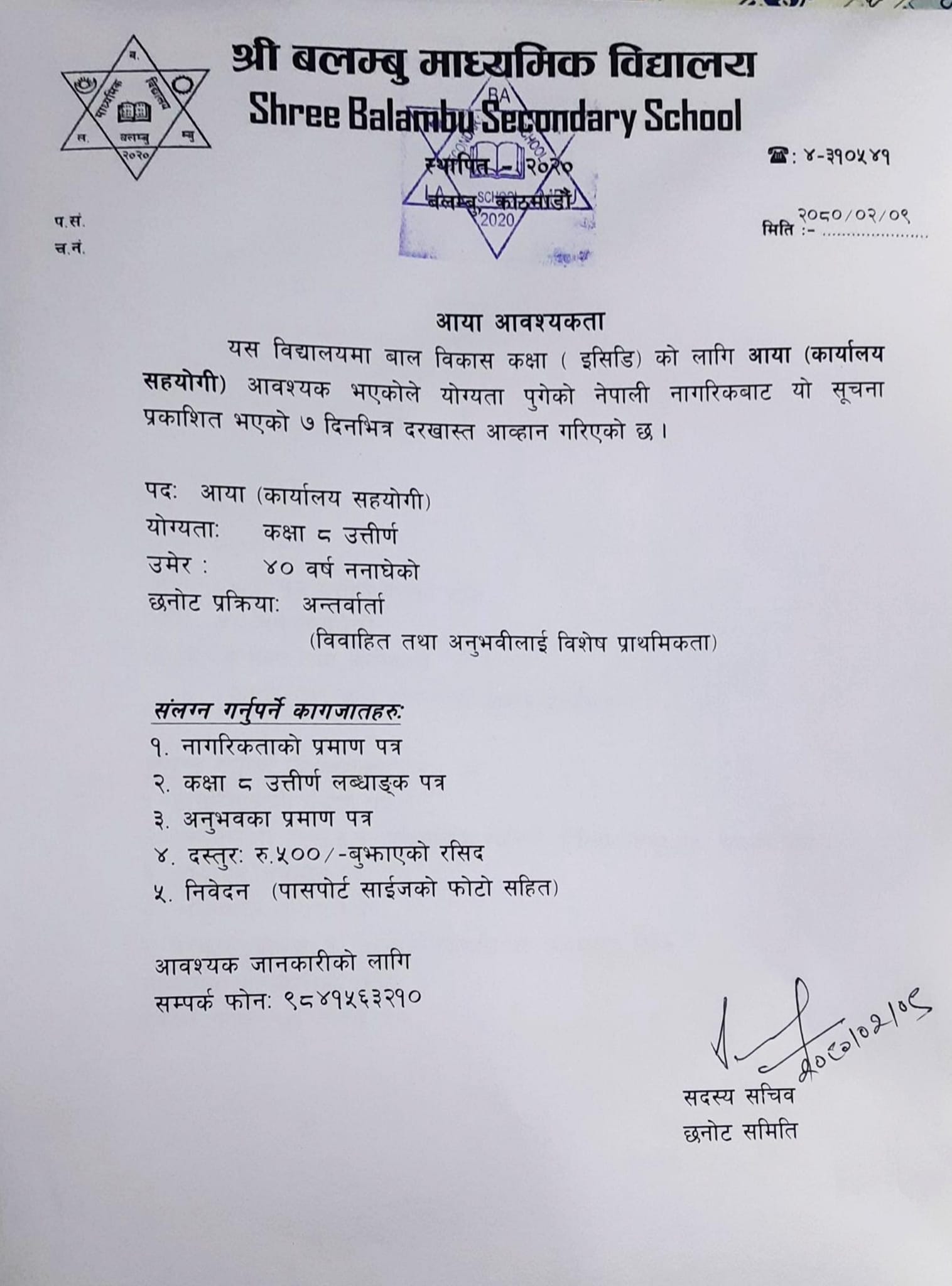 कक्षा ८ उत्तीर्ण गरेका इच्छुक व्यक्तिले सो पदमा दरखास्त पेश गर्न सक्ने विद्यालयले जनाएको छ ।