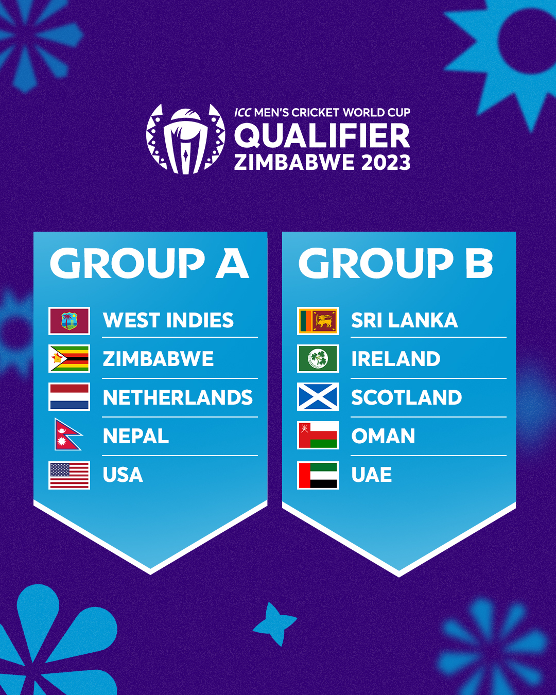 नेपाल वेष्टइण्डिज र जिम्बावे रहेको समूहमा परेको छ । आईसीसीले गरेको ड्र अनुसार नेपाल, वेष्टइण्डिज, जिम्बावे, नेदरल्याण्ड्स र अमेरिका ‘समूह ए’मा परेका हुन् ।