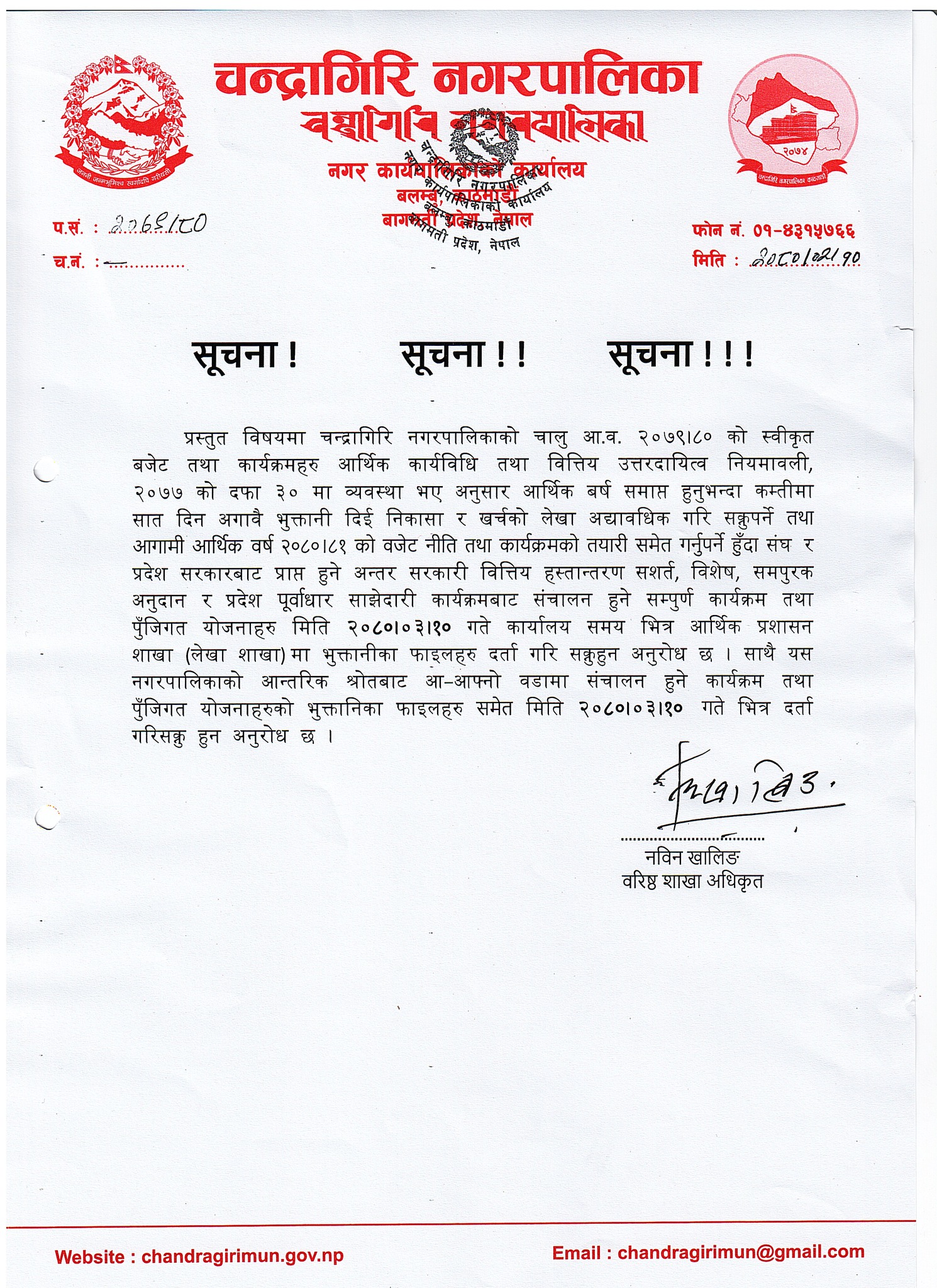 चन्द्रागिरि नगरपालिकाले नगर क्षेत्रभित्र चालु आर्थिक वर्षमा सम्पादन भइसकेका र भइरहेका योजनाहरूको भुक्तानीका लागि समयसीमा तोकेको छ ।