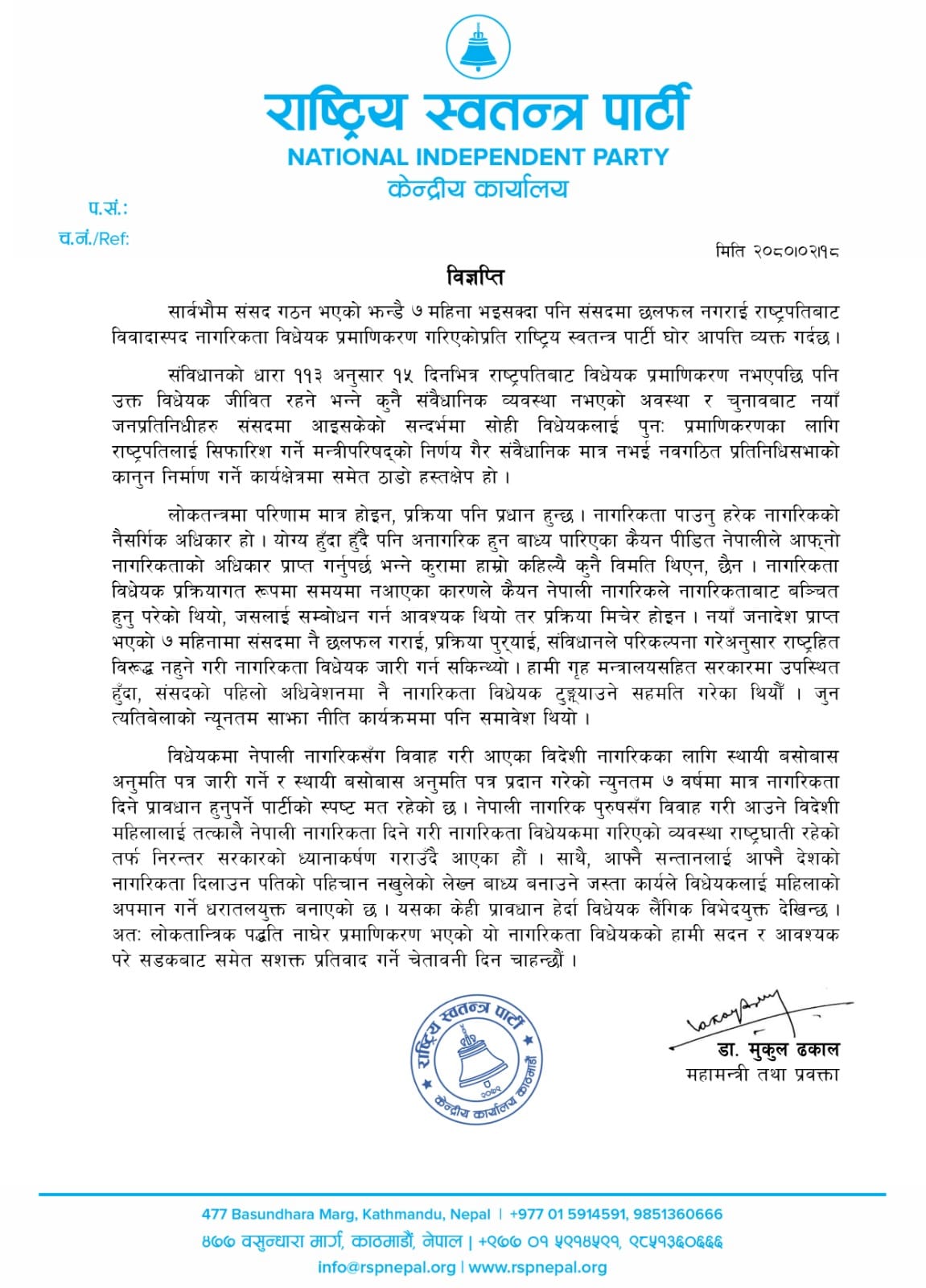 राष्ट्रिय स्वतन्त्र पार्टीले सार्वभौम संसद गठन भएको झन्डै ७ महिना भइसक्दा पनि संसदमा छलफल नगराई राष्ट्रपतिबाट विवादास्पद नागरिकता विधेयक प्रमाणिकरण गरिएकोप्रति घो आपत्ति जनाएको छ । साथै लोकतान्त्रिक पद्धति नाघेर प्रमाणिकरण भएको नागरिकता विधेयकको सदन र आवश्यक परे सडकबाट समेत सशक्त प्रतिवाद गर्ने चेतावनी दिएको छ ।