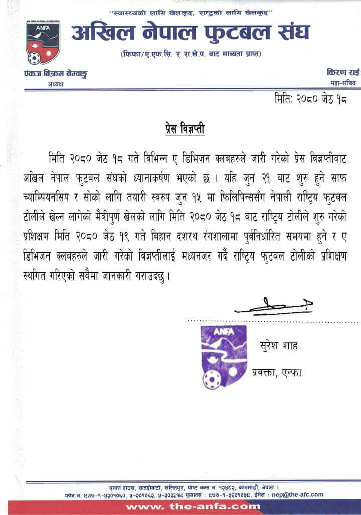 बिहीबार १० क्लबले लिग समाप्त नहुँदासम्म खेलाडी नछोड्ने बताएपछि अखिल नेपाल फुटबल संघ (एन्फा)ले एक विज्ञप्ति जारी गर्दै राष्ट्रिय टोलीको बन्द प्रशिक्षण स्थगित गरिएको जनाएको हो ।