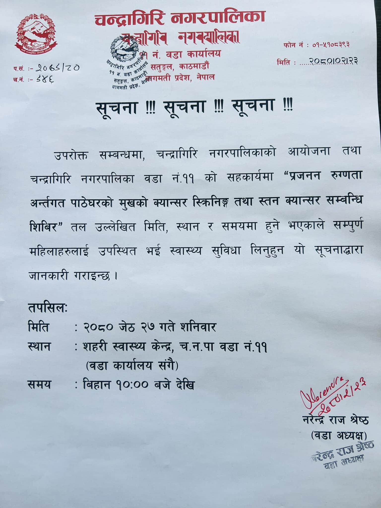 चन्द्रागिरि नगरपालिका तथा वडा कार्यालयको संयुक्त तत्वावधान सञ्चालन हुने सो शिविरमा महिलाहरूमा हुने स्तन क्यान्सर सम्बन्धी चेक जाँच समेत हुने जनाइएको छ ।