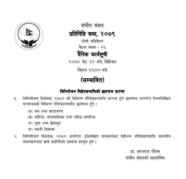 बैठकमा वन तथा वातावरण मन्त्रालय, महिला, बालबालिका तथा ज्येष्ठ नागरिक मन्त्रालय, युवा तथा खेलकुद मन्त्रालय र सहरी विकास मन्त्रालयका विभिन्न शीर्षकमाथि छलफल हुने संसद् सचिवालयले जानकारी दिएको छ ।