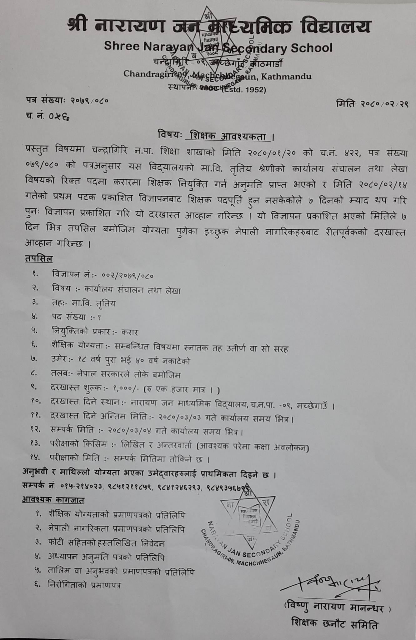 चन्द्रागिरि नगरपालिका-९ मच्छेगाउँस्थित नारायणजन माध्यमिक विद्यालयले मावि तहमा शिक्षक पदपूर्तिका लागि सूचना जारी गरेको छ ।