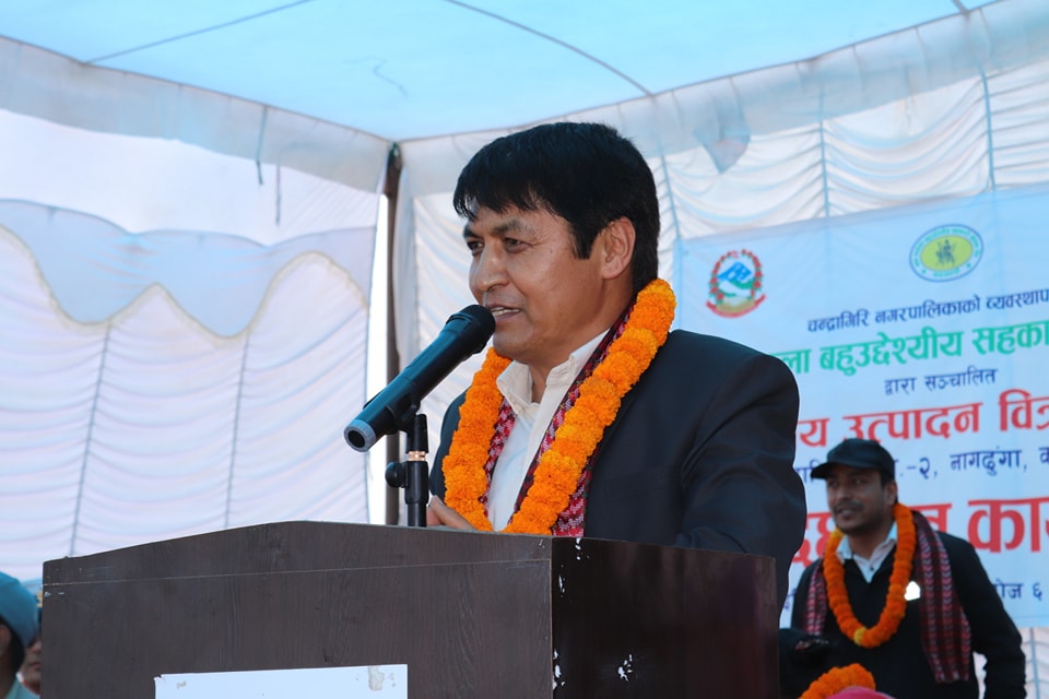 स्थानीय उत्पदानको बिक्री कक्षको उद्घाटनपछि संक्षिप्त प्रतिक्रिया दिनुहुँदै नगरप्रमुख घनश्याम गिरीले चन्द्रागिरि नगरपालिकाले विगतमा नगरबासीलाई प्रदान गरेको विभिन्न उत्पादनमुलक तालिमलाई आय आर्जनसँग जोड्न बिक्री केन्द्र स्थापना भएको जानकारी दिनुभयो ।