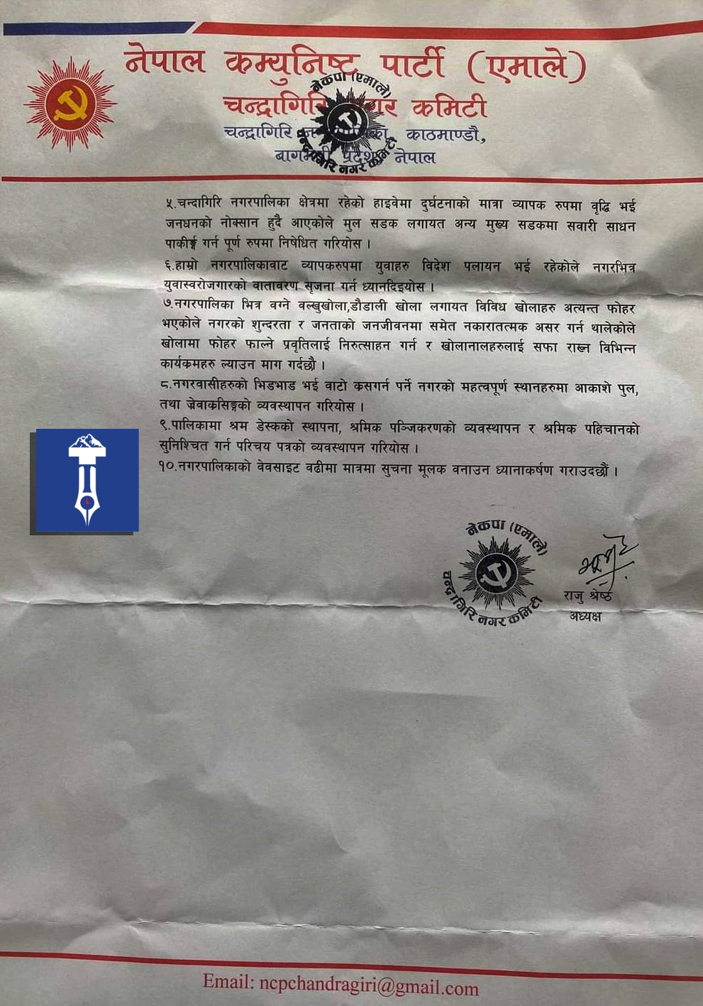 मंगलबार सो पार्टीका चन्द्रागिरि नगर कमिटि अध्यक्ष राजु श्रेष्ठ नेतृत्वको टोलीले नगरप्रमुखलाई विभिन्न १० बुँदा समेटिएको ध्यानाकर्षण पत्र बुझाएको हो ।