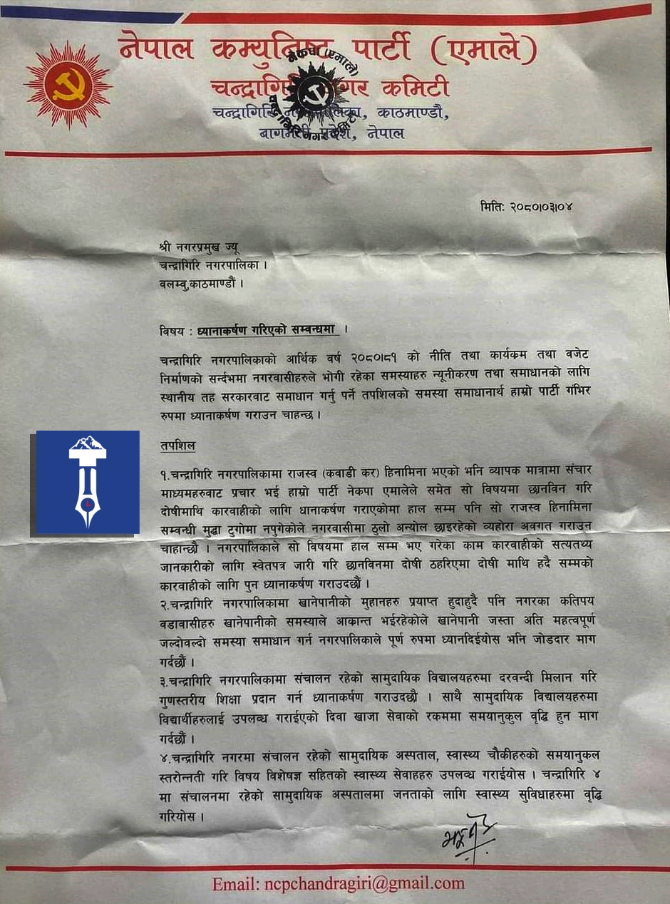 मंगलबार सो पार्टीका चन्द्रागिरि नगर कमिटि अध्यक्ष राजु श्रेष्ठ नेतृत्वको टोलीले नगरप्रमुखलाई विभिन्न १० बुँदा समेटिएको ध्यानाकर्षण पत्र बुझाएको हो ।