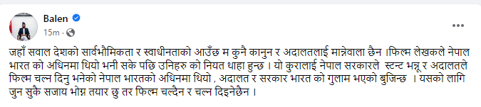 सामाजिक सञ्जालमा मेयर बालेन लेख्छन् अदालतको कारबाही भोग्छु तर फिल्म चल्न दिन्न्ँ