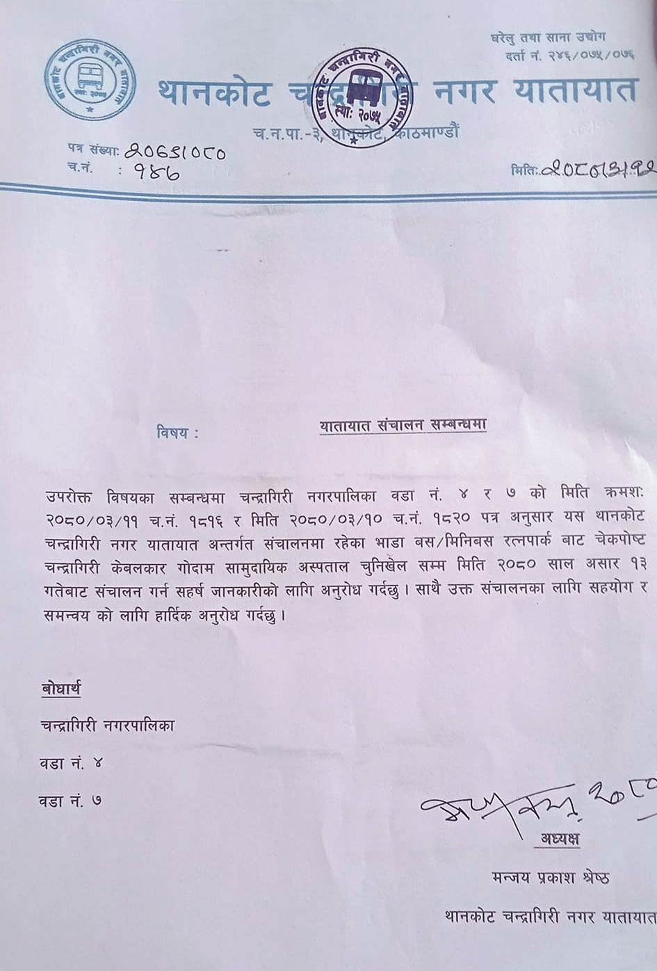 थानकोट-चन्द्रागिरि नगर यातायातले अब रत्नपार्कबाट थानकोट चेकपोष्ट हुँदै गोदाम चुनिखेलसम्म सेवा दिने भएको छ ।