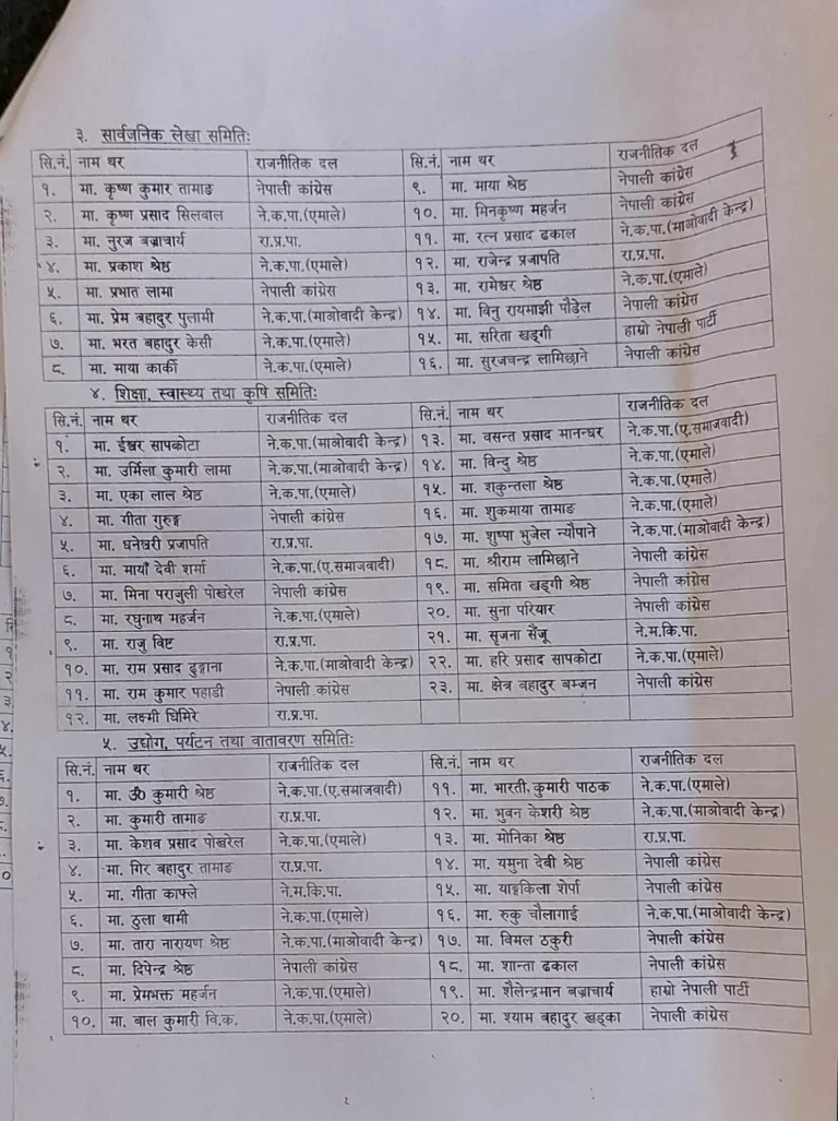 काठमाडाैं क्षेत्र नं. १० प्रदेश २ का सांसद् नेकपा समाजवादीकी रमा आलेमगर प्रदेशको अर्थ तथा विकास समितिको सदस्यका रूपमा रहने बताइएको छ । यसैगरी नेपाली काँग्रेसकी सांसद् यमुनादेवी श्रेष्ठ तथा नेकपा एमालेका सांसद् केशव प्रसाद पोखरेल प्रदेशको उद्योग पर्यटन वन तथा वातावरण समितिको सदस्यका रूपमा रहने बताइएको छ ।