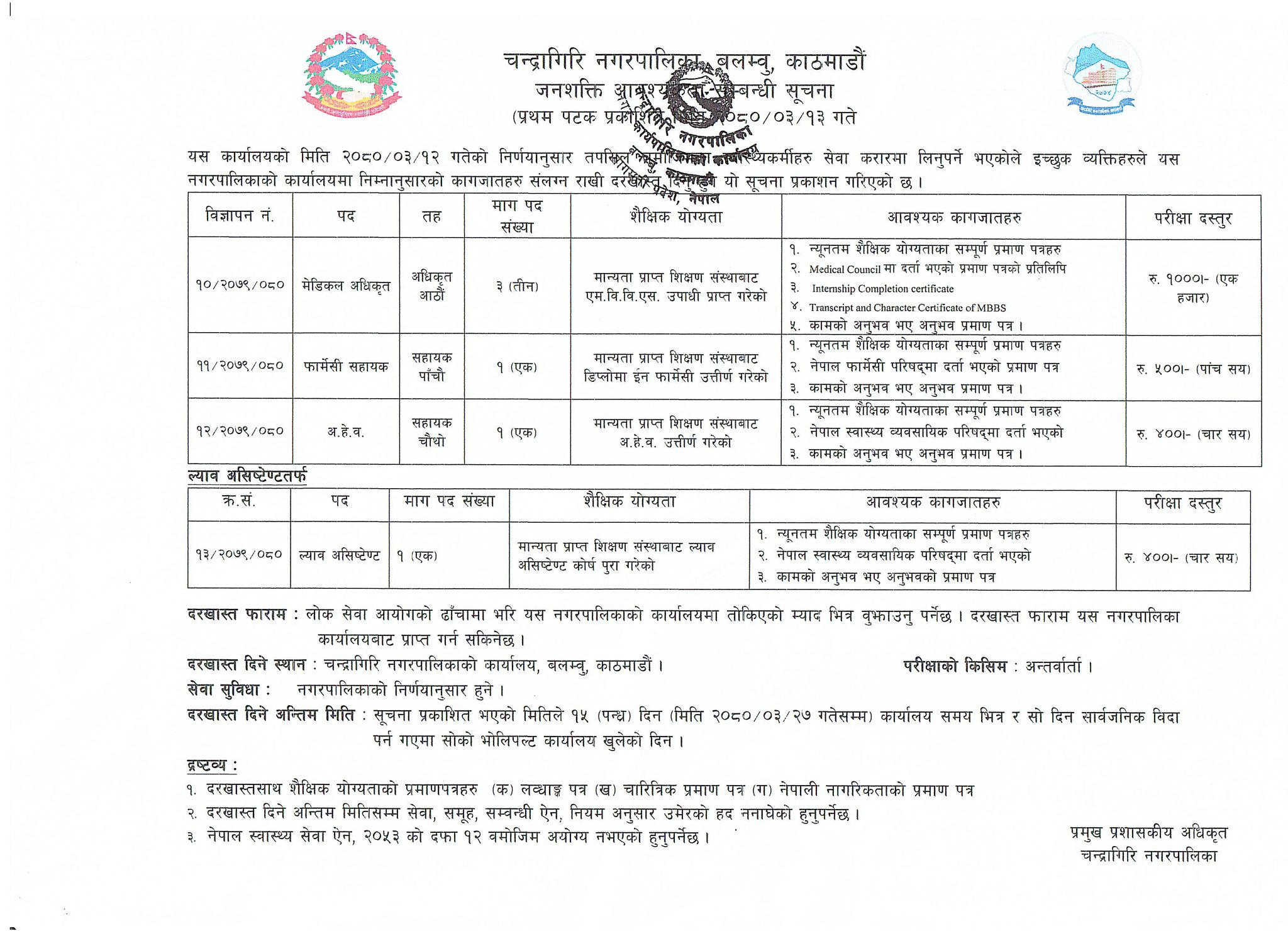 सूचनामा जनाइए अनुसार मेडिकल अधिकृत तीन जना, फार्मेसी सहायक १ जना, अहेव १ जना तथा ल्याब असिस्टेन्ट एक जनाका लागि दरखास्त आह्लान गरेको हो ।