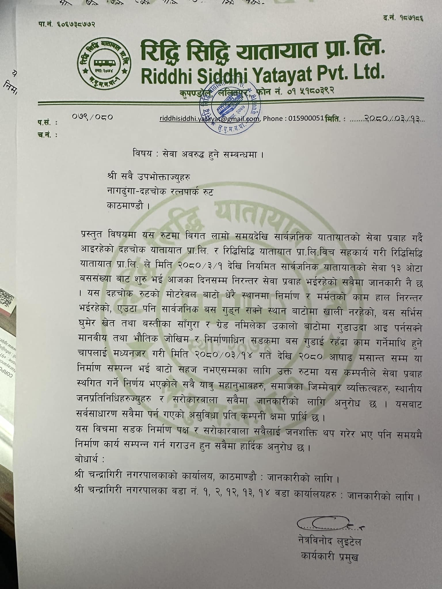 रिद्धि सिद्धि यातायातले नागढुङ्गा-दहचोक-रत्नपार्क रूटमा सेवा तत्कालका लागि स्थगित गर्ने भएको छ ।