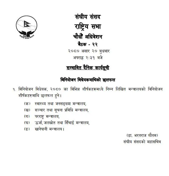 यस्तै, बैठकमा कानुन, न्याय तथा संसदीय मामिलामन्त्री धनराज गुरुङले मुलुकी संहिता सम्बन्धी केही नेपाल ऐनलाई संशोधन गर्ने विधेयक– २०८० माथि दफावार छलफल गरियोस् भन्ने प्रस्ताव प्रस्तुत गर्नेछन् ।