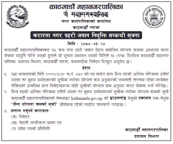 काठमाडौँ महानगरपालिकाले ६५ जना नगर प्रहरी करार सेवामा पदपूर्ति गर्ने भएको छ ।