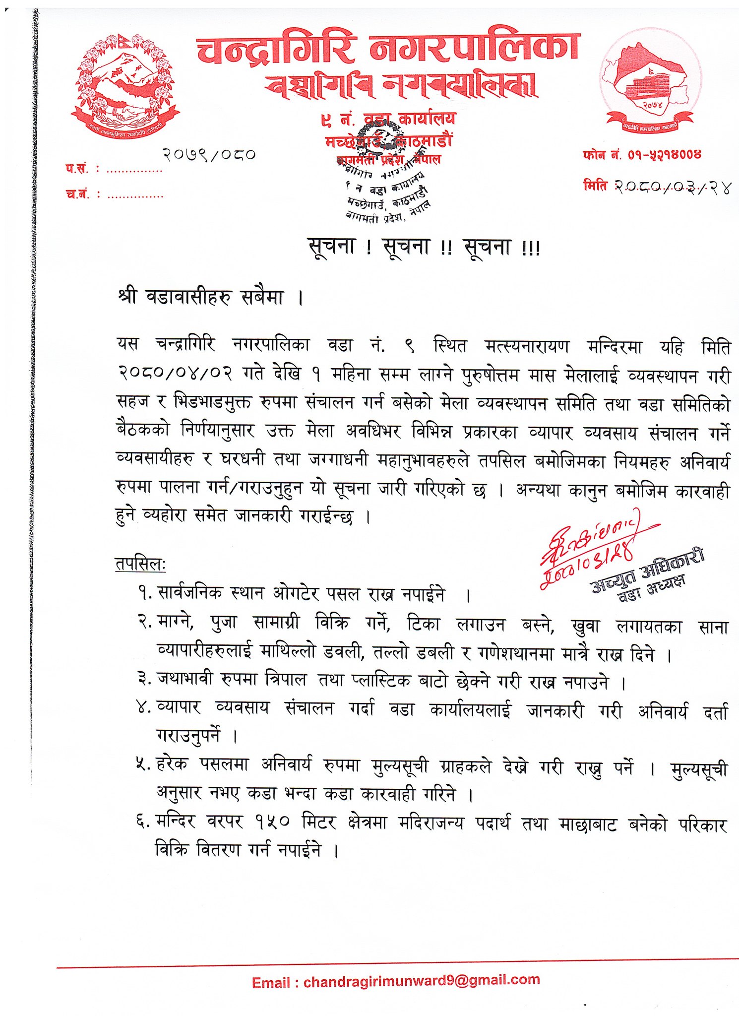 यही साउन २ गतेदेखी १ महिनासम्म लाग्ने पुरूषोत्तम मास मेलाको व्यवस्थापनका लागि वडा कार्यालयको अग्रसरतामा मेला व्यवस्थापनका लागि विभिन्न निर्णय गरिएको वडाध्यक्ष अच्यूत अधिकारीले जानकारी दिनुभयो ।