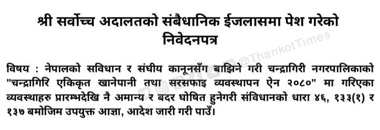 रिटमा नेपालको संविधान र संघीय कानुन सँग बाझिने गरि चन्द्रागिरि नगरपालिकाको “चन्द्रागिरि एकीकृत खानेपानी तथा सरसफाई व्यवस्थापन ऐन २०८० मा गरिएका व्यवस्थाहरु प्रारम्भदेखि नै अमान्य र बदर घोषित हुने गरि संविधानको धारा ४६ , १३३ (१) र १३७ बमोजिम उपयुक्त आज्ञा, आदेश जारी गरी पाउँ भन्ने व्यहोरा रहेको बताइएको छ ।