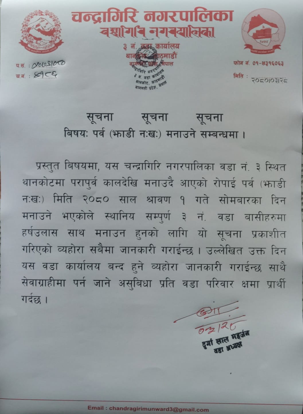 सो दिन चन्द्रागिरि नगरपालिका ३ थानकोटको वडा कार्यालय भने बन्द रहने वडाध्यक्ष दुर्गालाल महर्जनले जानकारी दिनुभयो ।
